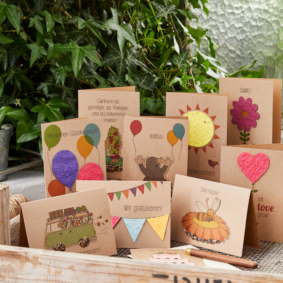 Du bist gefühlt ständig damit beschäftigt, die passende Grußkarte für die verschiedensten Anlässe zu finden? Das kann auf Dauer ganz schön anstrengend sein. Muss es aber nicht, denn unser Karten-Set kannst du ganz bequem einmal bestellen und erhältst 10 liebevoll gestaltete Grußkarten zu verschiedenen Anlässen. Ob Geburtstag, Hochzeit oder ein einfacher kleiner Gruß – das Set lässt keine Wünsche offen. Das Allerbeste: Mit unseren Grußkarten freut sich der Beschenkte gleichzeitig über einen Blumenstrauß aus bunten Wildblumen!
