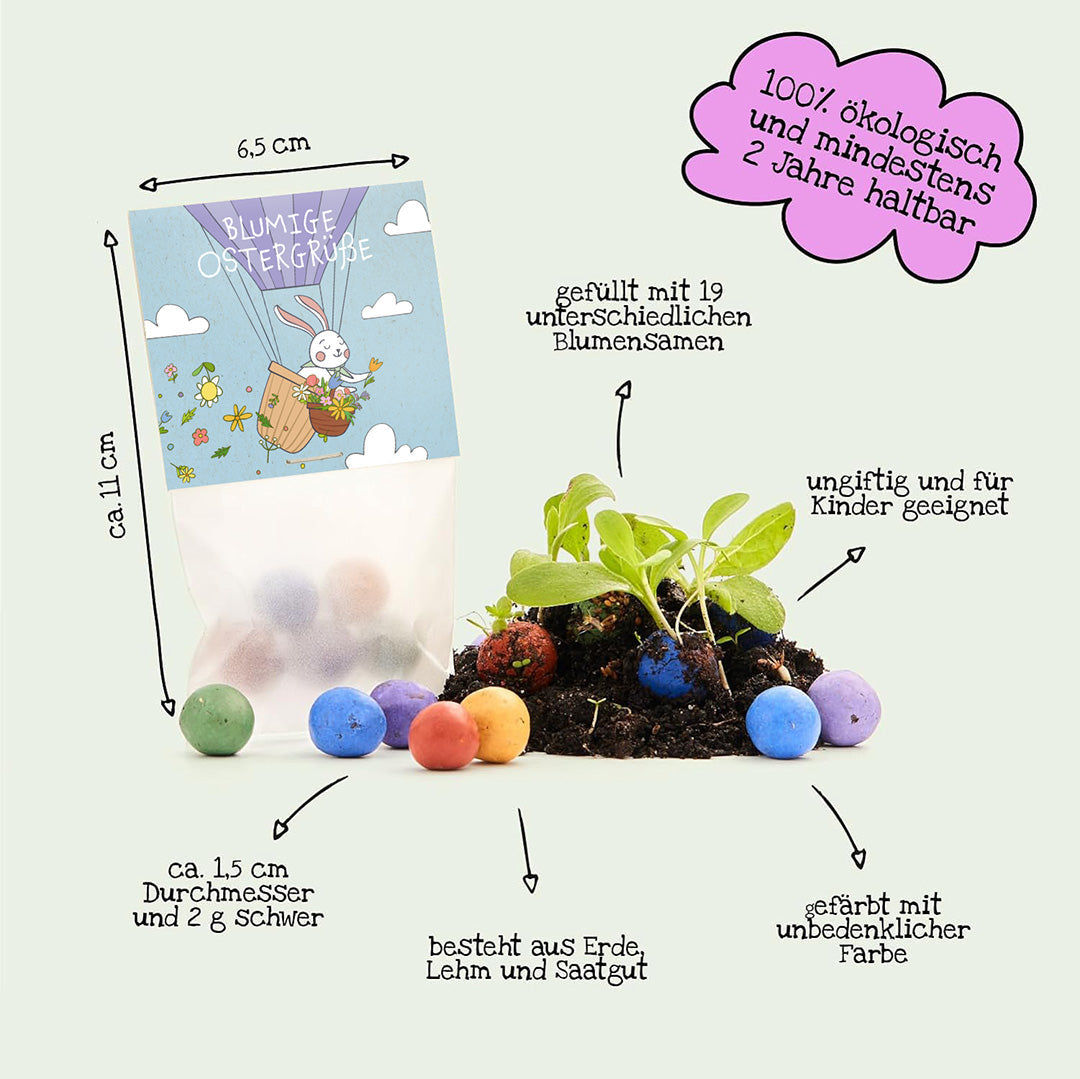 Kreatives Frühlingsgeschenk: Enthält 10 im Frühlingsdesign gestaltete Tütchen, gefüllt mit je 5 bunten Saatkugeln, aus denen Wildblumen wachsen. Das ideale Geschenk im Frühling oder zu Ostern für Kinder, Freunde und Kollegen. Auch eine tolle Zugabe zum Osternest!
