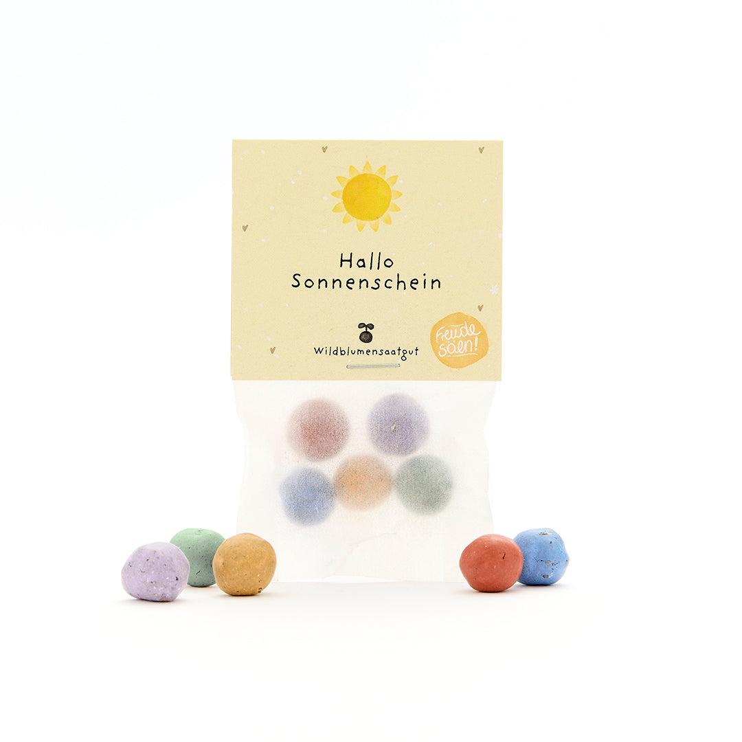 Blumiges Dankeschön mit Herz: Dieses Set enthält ein liebevoll gestaltete Tütchen mit 5 bunten Blumenmurmeln und der fröhlichen Aufschrift "Hallo Sonnenschein". Eine charmante Geste, um jemandem den Tag zu verschönern – eine Geschenkidee für alle, die ein Lächeln verdient haben.