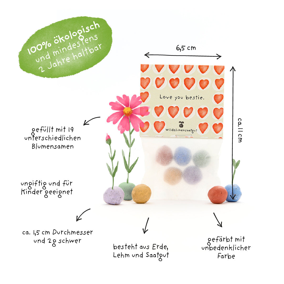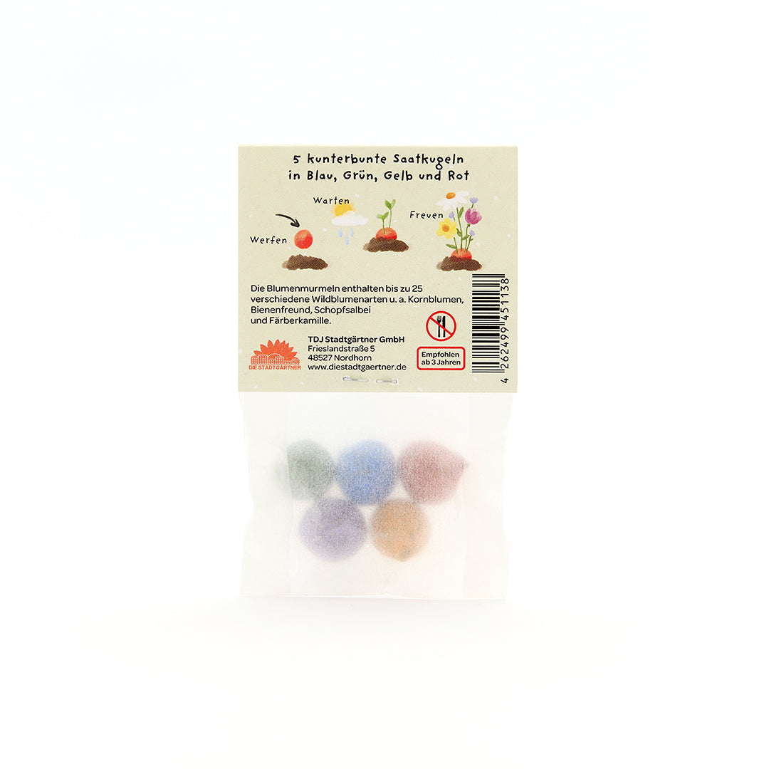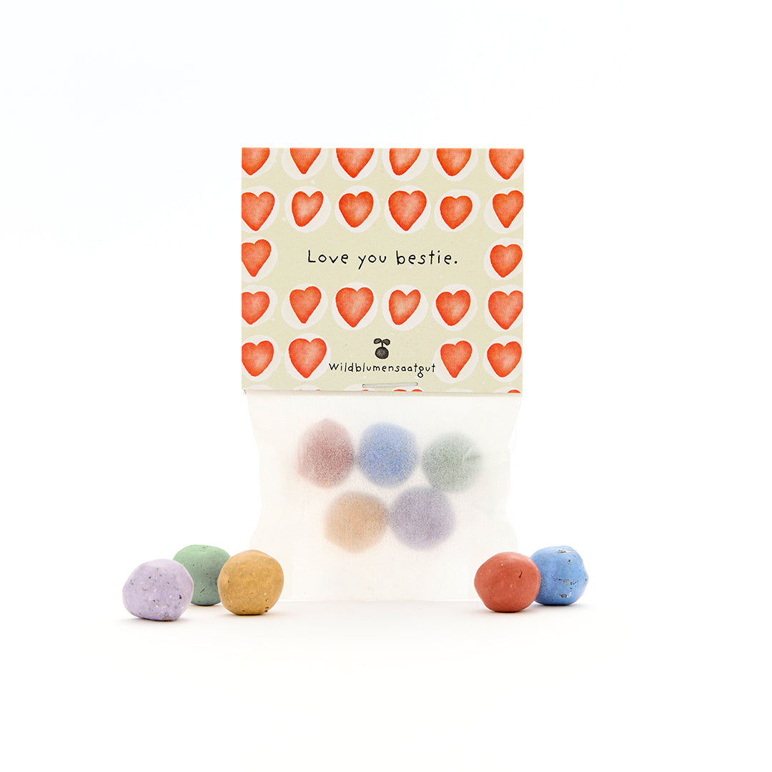 Sag's mit Herz & Blume: Die Blumenmurmeln lassen aus kleinen Gesten große Freude wachsen – ganz ohne Müll, Plastik oder Schnickschnack. Einfach auswerfen, gießen und sich gemeinsam an der Blütenpracht freuen. Ein Geschenk, das eure Freundschaft aufblühen lässt.
