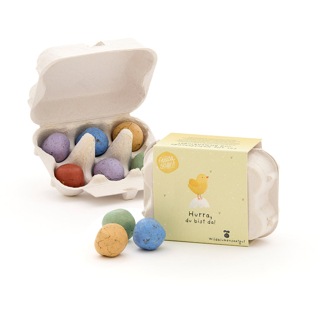 Tolles Geschenk zur Geburt: Die 6 bunten Blumenmurmeln im Mini-Eierkarton mit der Aufschrift "Hurra, du bist da" sind eine zauberhafte Geschenkidee für frischgebackene Eltern, Großeltern oder im Wochenbett, die in Erinnerung bleibt.