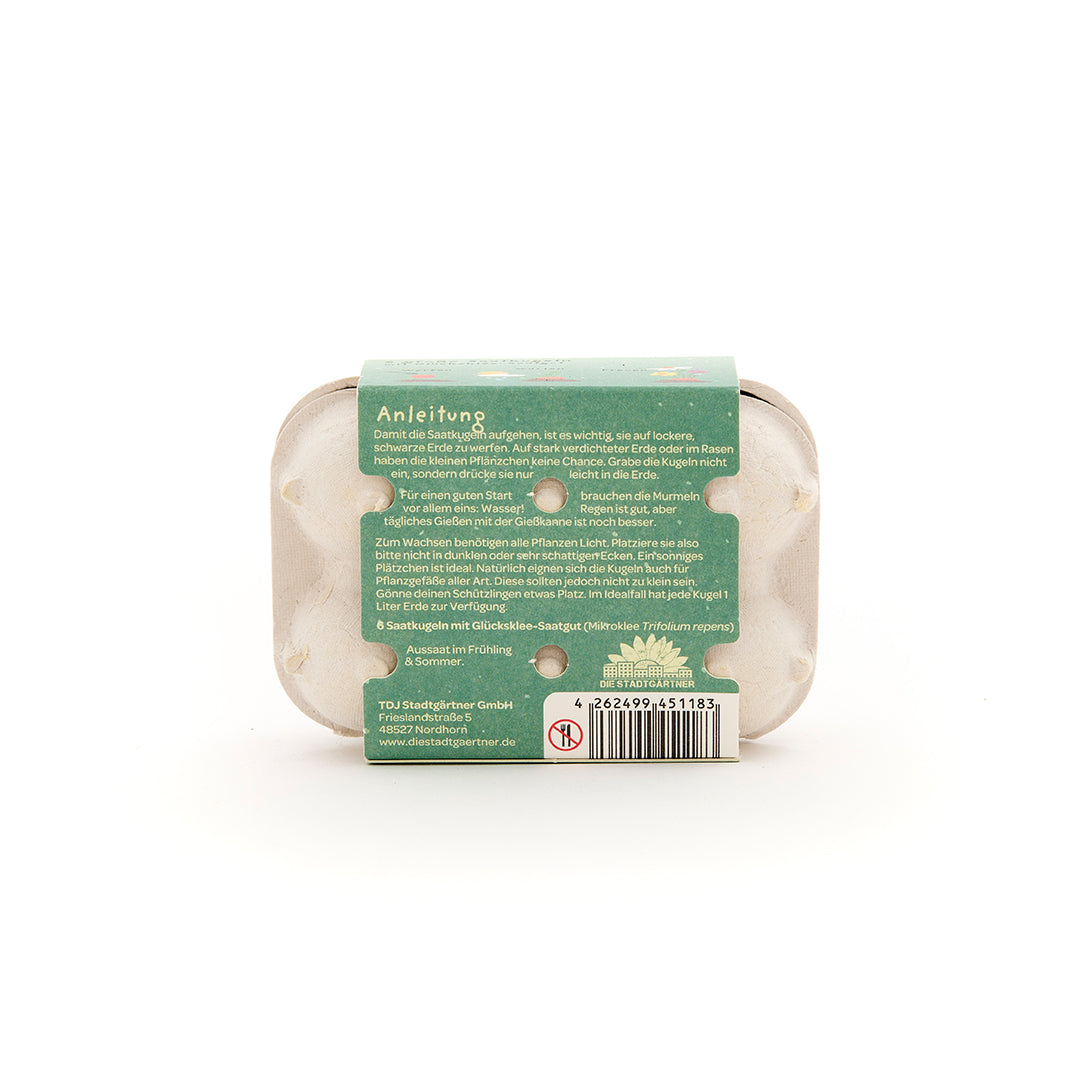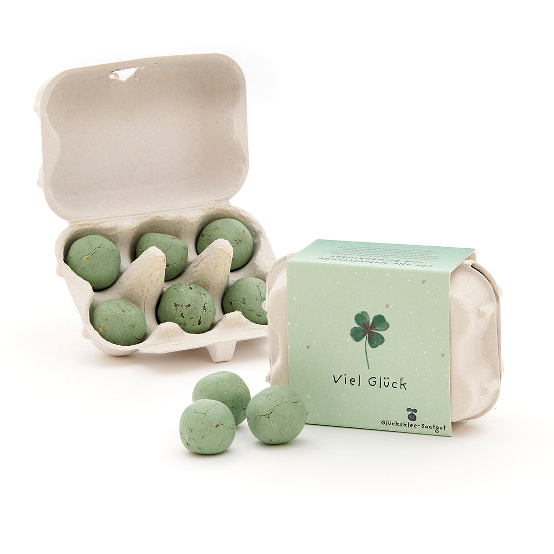 6 bunte Blumenmurmeln im Eierkarton "Viel Glück"