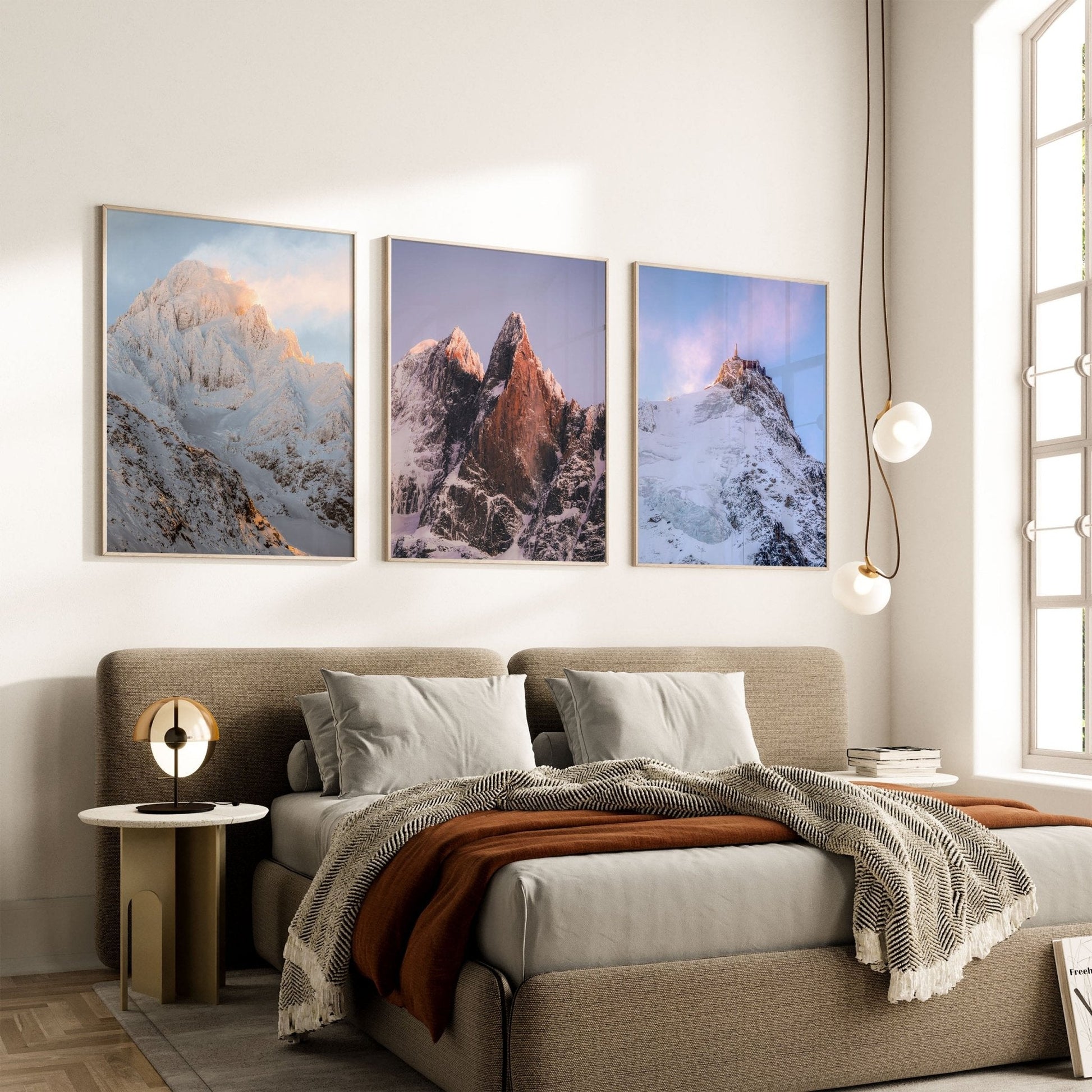 A stunning triptych print capturing the Aiguille du Midi, Les Drus, and Aiguille du Chardonnet bathed in golden evening light over Chamonix.