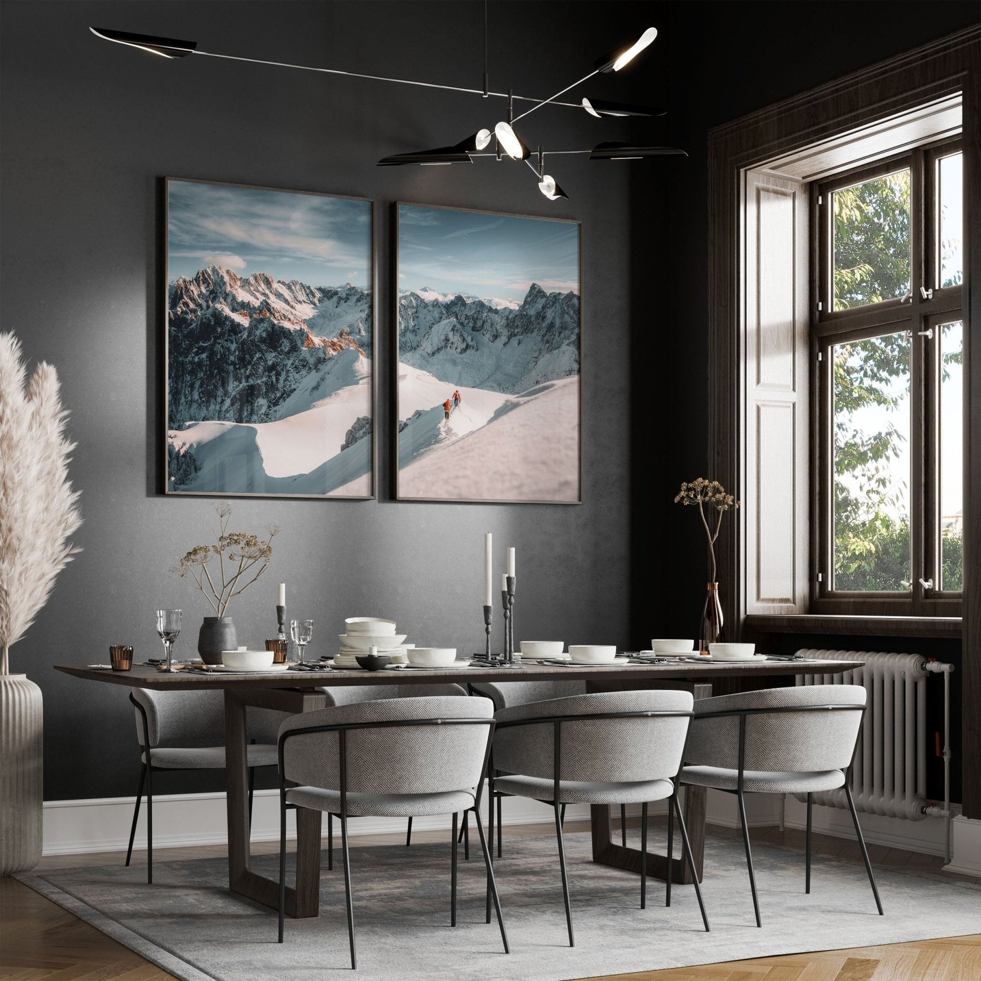 A striking two-piece print set capturing the dramatic peaks and snow-covered ridges of the Aiguille du Midi, high above Chamonix.