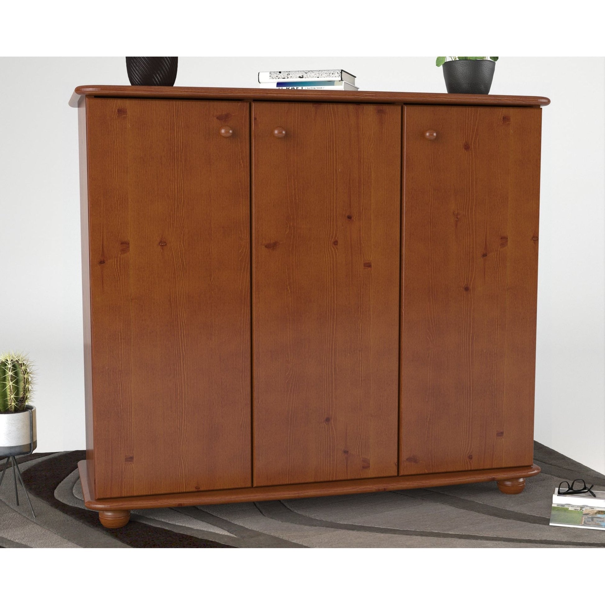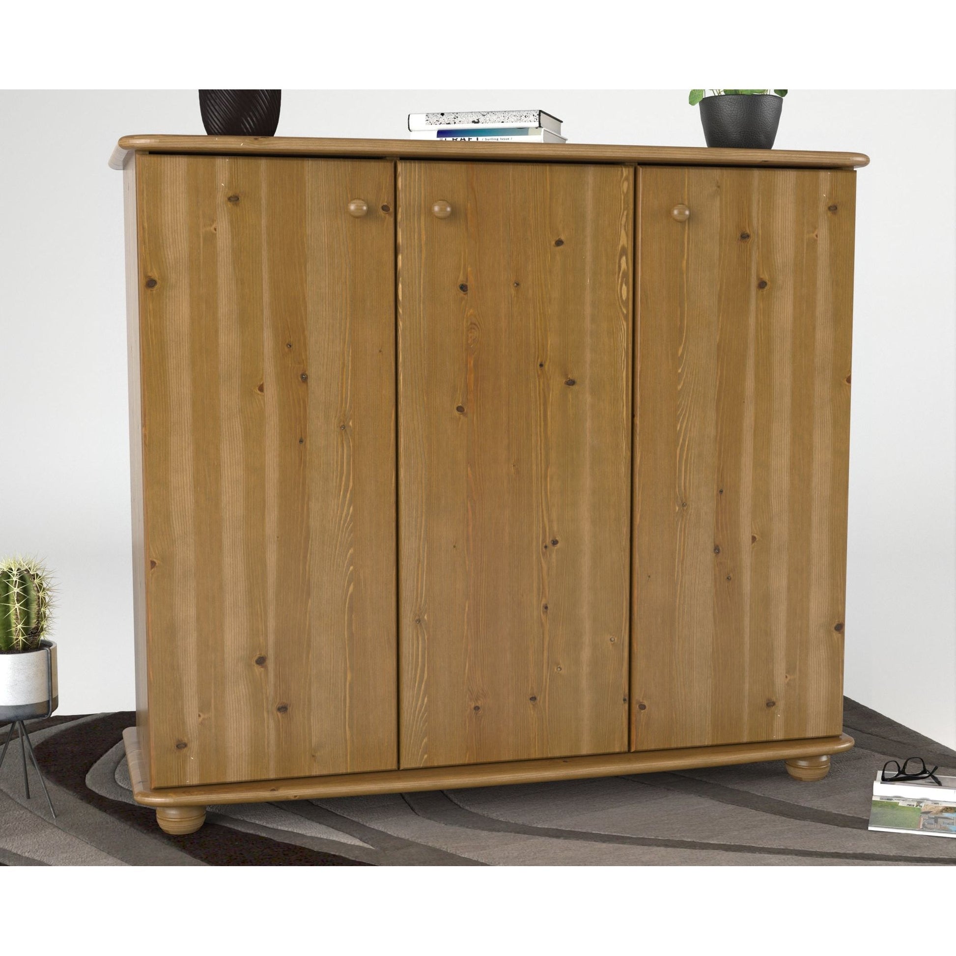 Keywords: Kiefer Massivholzkommode, 3-türige Kommode, Regalfächer, nachhaltige Kommode, Massivholzmöbel, Stauraummöbel, Holzkommode