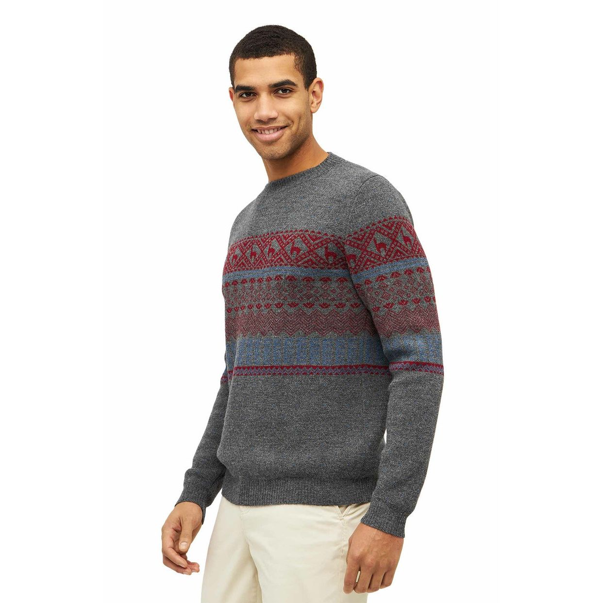 Typisch für diesen hochwertigen Jacquard-Strickpullover ist das kunstvolle Muster im Brustbereich – ergänzt durch kleine stilisierte Alpakas, die ihm eine besondere Note verleihen. Das dreifarbige Design in Rot, Grau und Jeans-Blau passt ideal zu Jeans, Chinos oder Stoffhosen und macht den Pullover zum vielseitigen Allrounder im Winter.
