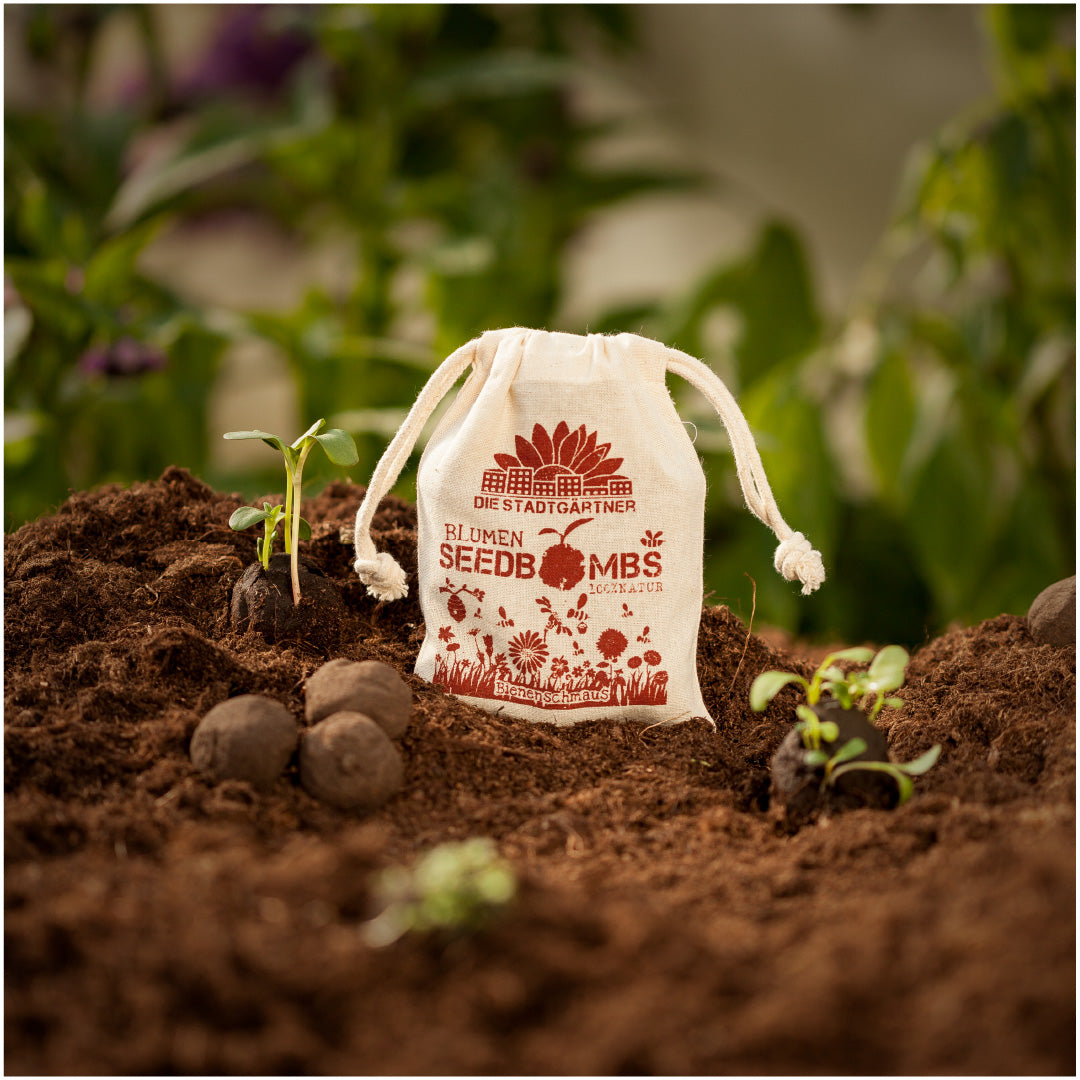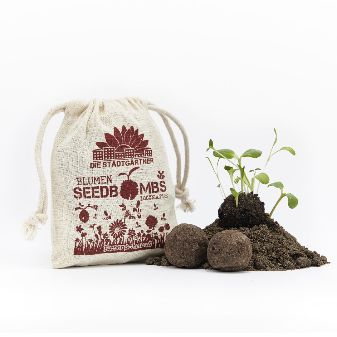 38 verschiedene Saatgutarten, z.B. Färberkamille, Hornschottenklee, Luzerne, Reseda, Thymian, Basilikum und Ysop. Eine leckere Speisekarte, auf die auch die anspruchvollste Biene fliegt. Der Jutebeutel enthält 8 walnussgroße Samenbomben bestehend aus Erde, Ton und ökologischem Saatgut.