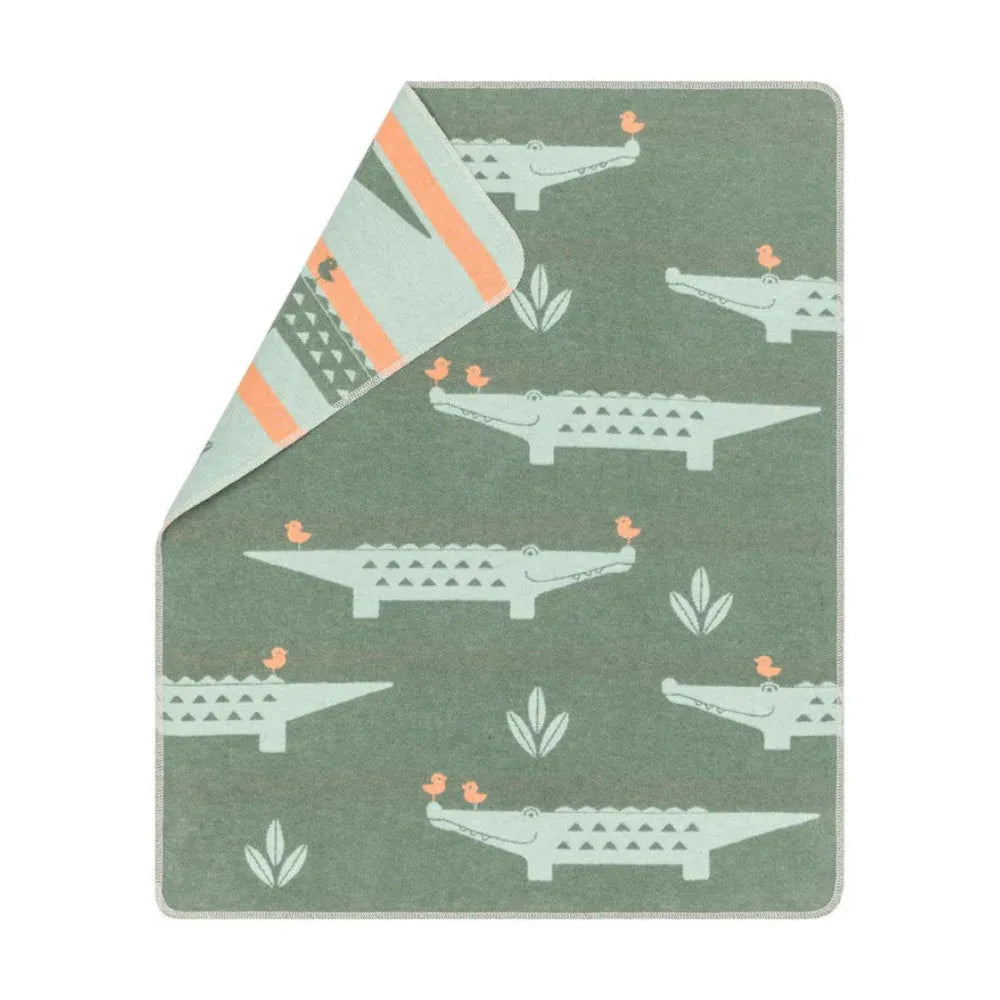 Decke: Eine Decke aus recycelter Baumwolle mit dem süßen Krokodil-Motiv begeistert mit einer harmonischen Farbkombination aus Dunkelgrün, Hellgrün und zartem Orange. Maße 90x70 cm. Jahrelang einsetzbar für Kinderwagen, Bettchen, Autositz und Co.