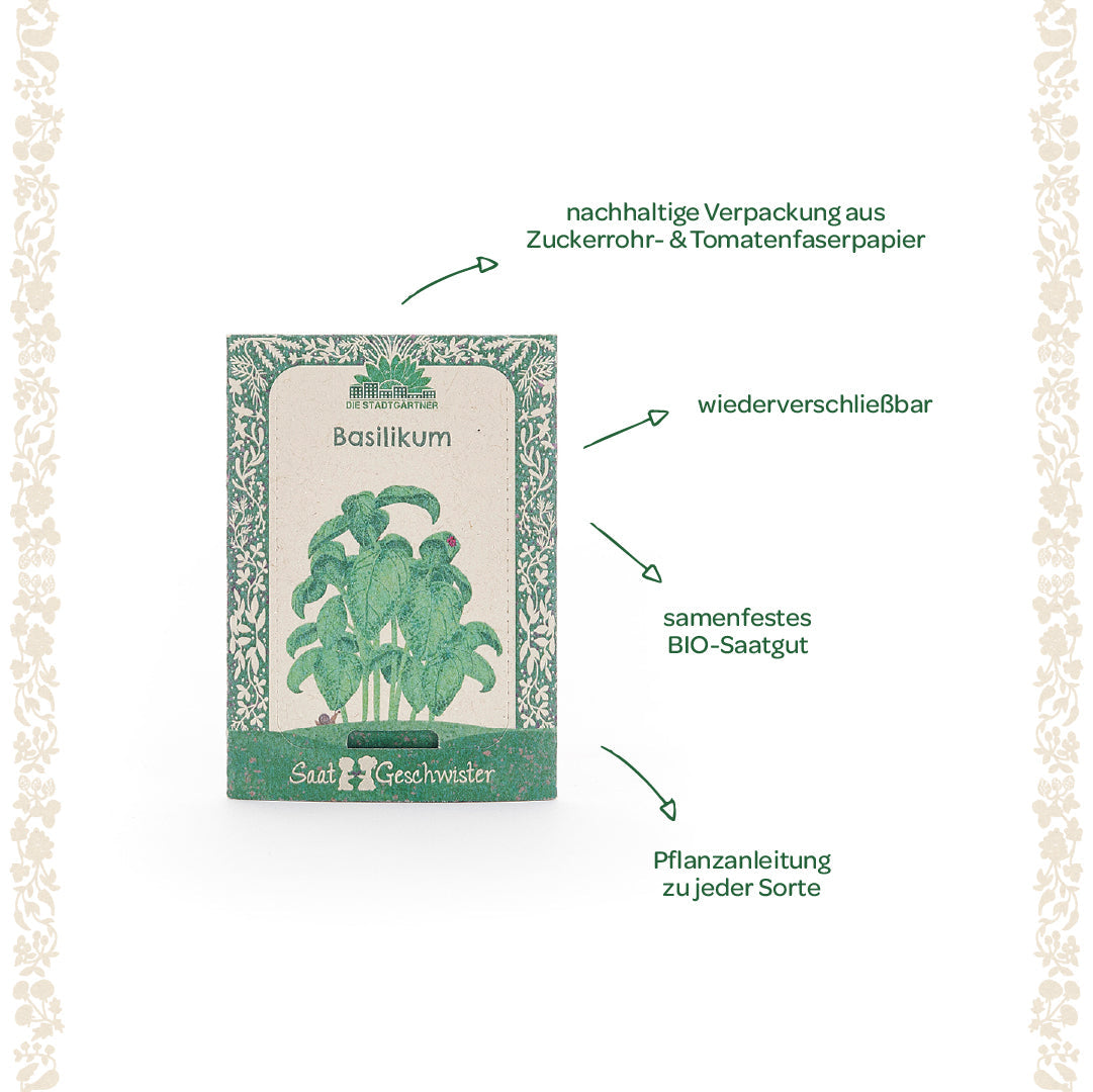 Nachhaltig: Die liebevoll gestaltete Verpackung besteht aus umweltfreundlichem Zuckerrohrpapier – perfekt für umweltbewusste Hobbyköche und Gärtner. Basilikum gedeiht ideal im Garten, auf dem Balkon oder auf der Fensterbank und bringt mediterranes Flair in jedes Zuhause.