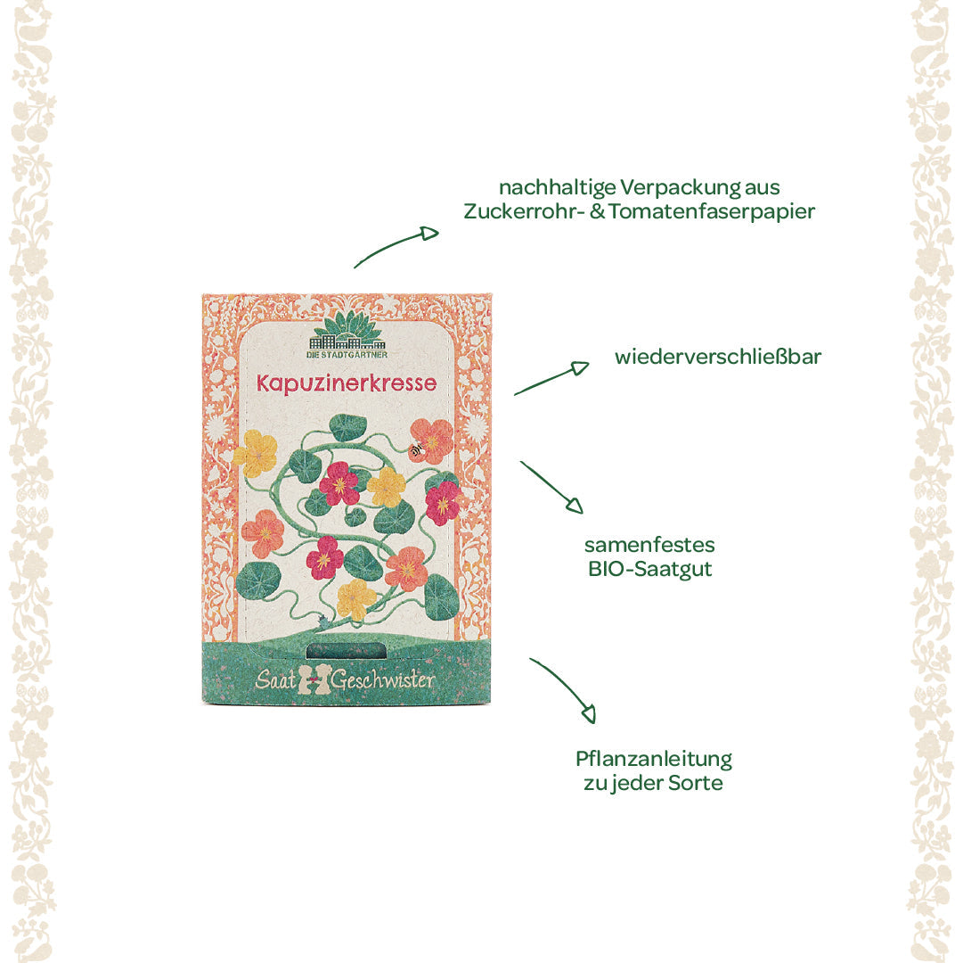 Eine besondere Geschenkidee: Das Kapuzinerkresse-Saatgut ist ein wunderschönes Geschenk für Gartenfreunde und Genießer. Ob als Mitbringsel, zum Geburtstag oder zu Weihnachten – es bringt leuchtende Blüten und Freude ins Zuhause.