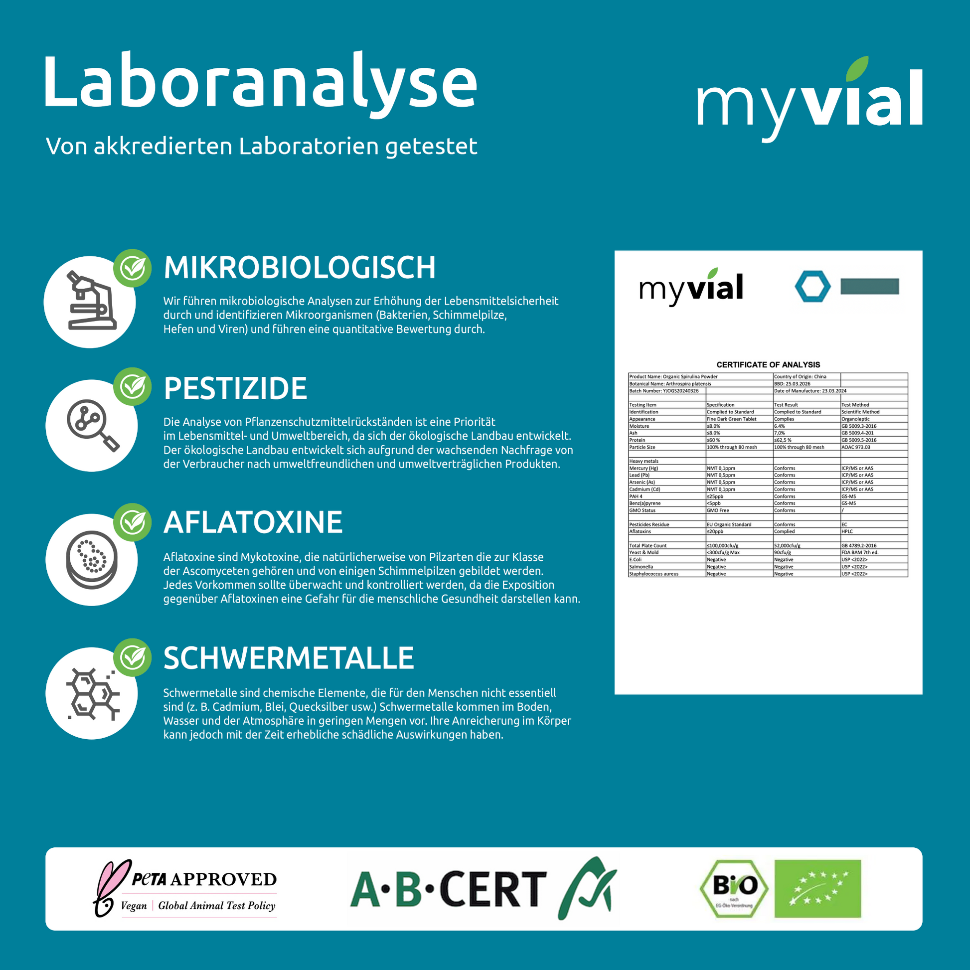 Unser Bio Spirulina Pulver ist 100 % vegan, frei von künstlichen Zusatzstoffen und nachhaltig produziert. Die schonende Verarbeitung sorgt für höchste Qualität, und unsere strengen Kontrollen garantieren, dass nur das Beste in deinen Körper gelangt – für dich und die Umwelt!
