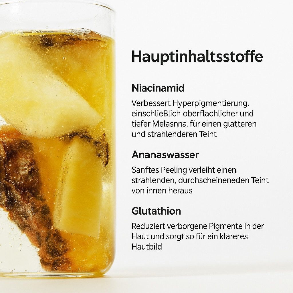 Die Formulierung basiert auf einem hochkonzentrierten Mix aus wirkstarken Inhaltsstoffen: Niacinamid sorgt für ein klares, ebenmäßiges Hautbild und verbessert die Hautstruktur, während high-purity Glutathione als starkes Antioxidans freie Radikale neutralisiert. Zusätzlich hilft Ananaswasser, auch bekannt als Ananas Sativus Fruit Water, bei der Reduktion von Hautverfärbungen – für einen sichtbar ausgeglichenen Teint.