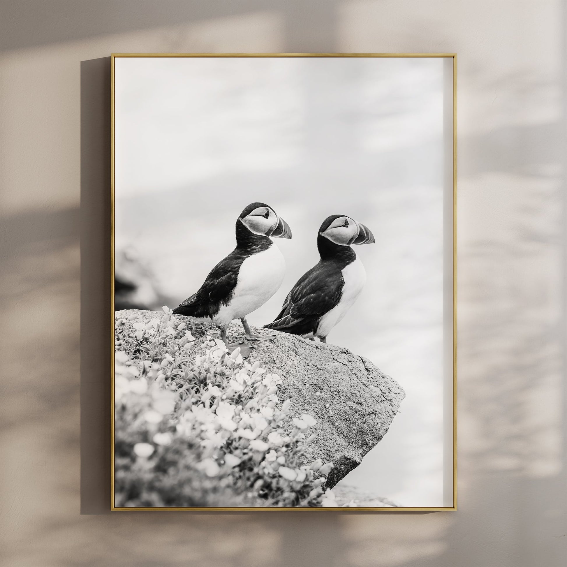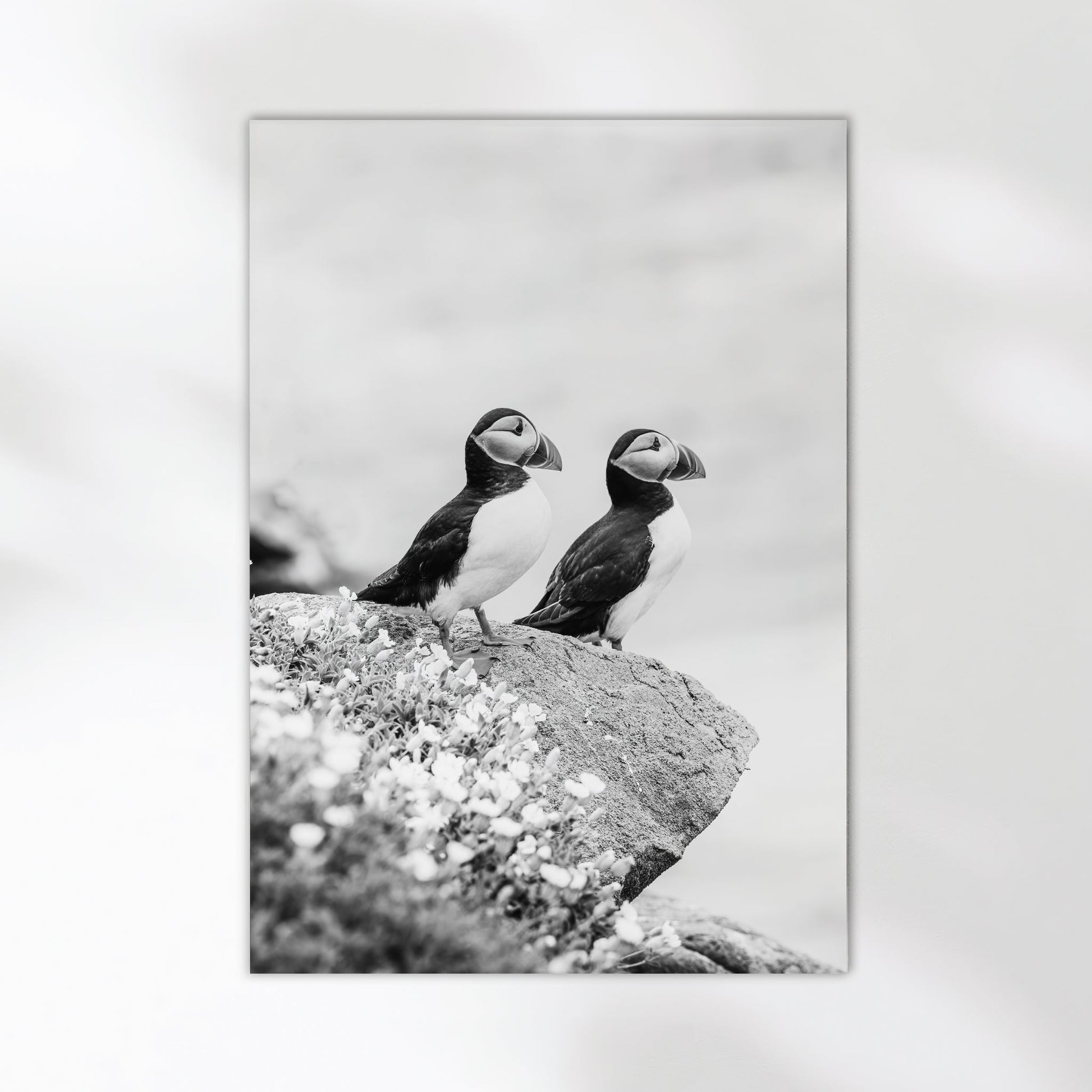 A pair of puffins stands poised on a rocky Irish cliff, captured in a striking black and white composition. This minimalist wildlife print blends soft textures and crisp contrast, making it a versatile piece for nature lovers or monochrome interior design. A quiet moment of wild beauty, perfect for calm, modern spaces.