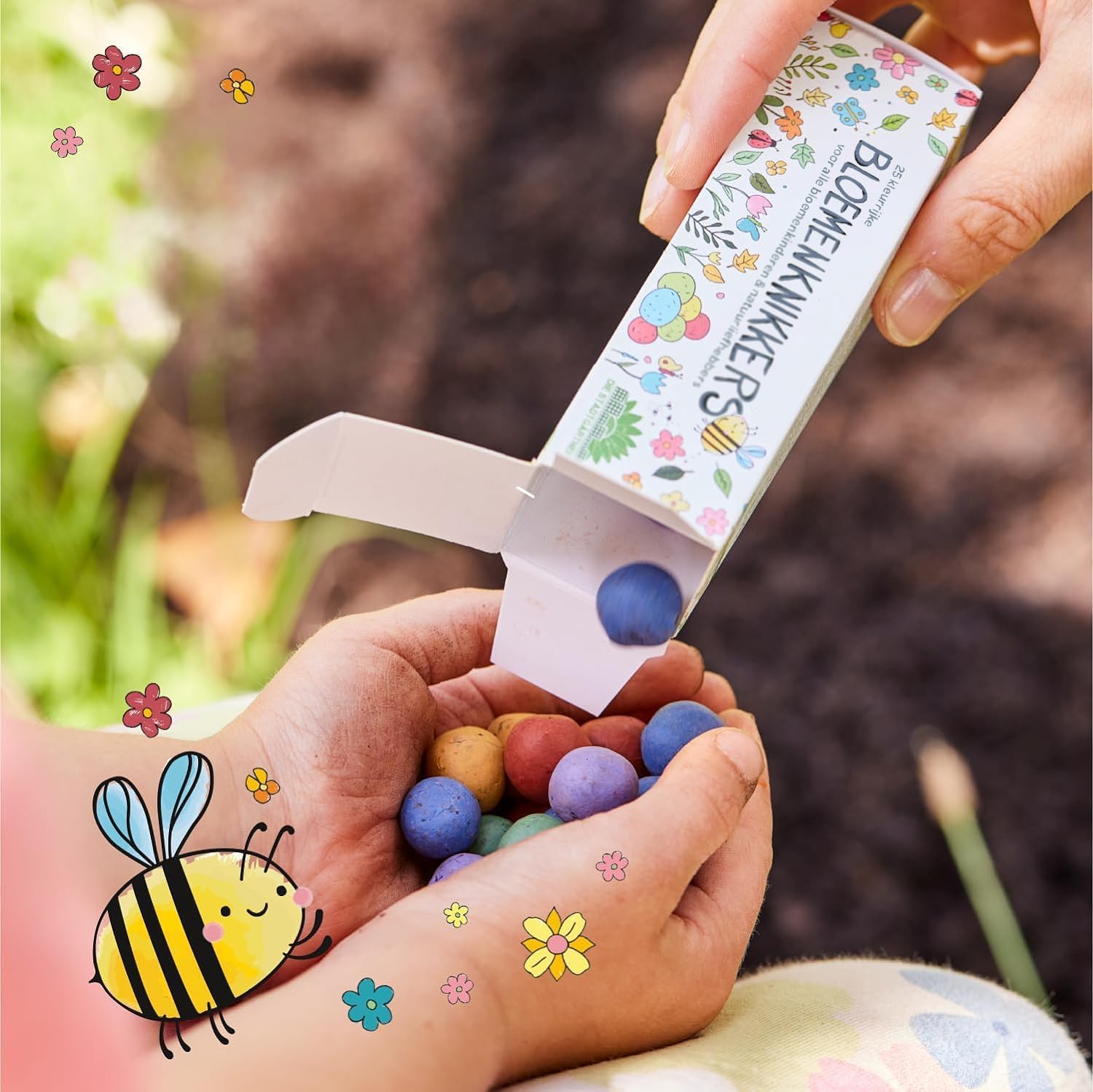 KLEURRIJKE BLOEMENKNIKKERS: Onze zaadbommen hebben een nieuwe look en zijn nu vrolijk gekleurd in plaats van saai bruin! Om de seedbombs meer kleur te geven worden slechts maïszetmeel & natuurlijke kleurstof toegevoegd. Bloemenknikker doorsnede ø 1,5 cm.