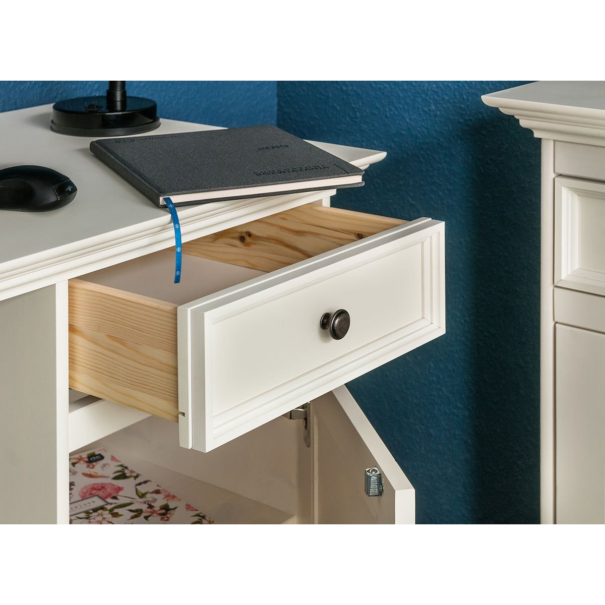 Ob zum Arbeiten, Lernen oder kreative Projekte – dieser zeitlose Holzschreibtisch bietet mit Schubladen und einem geräumigen Schrank genügend Stauraum für Bücher, Dokumente & Schreibutensilien. Die edle Verarbeitung mit dezenten Fräsungen und stilvollen Griffen unterstreicht den Provence-Charme dieses Möbelstücks.