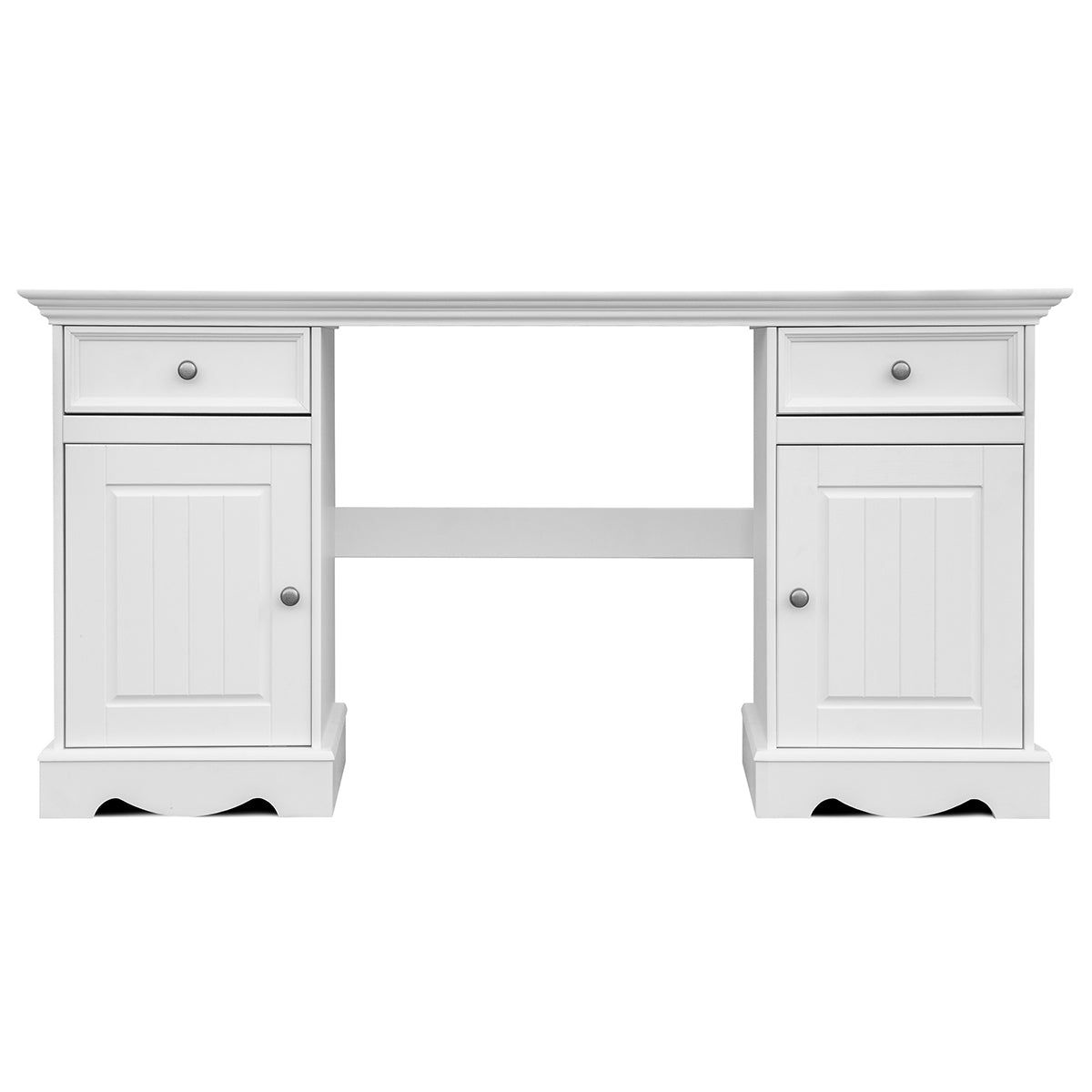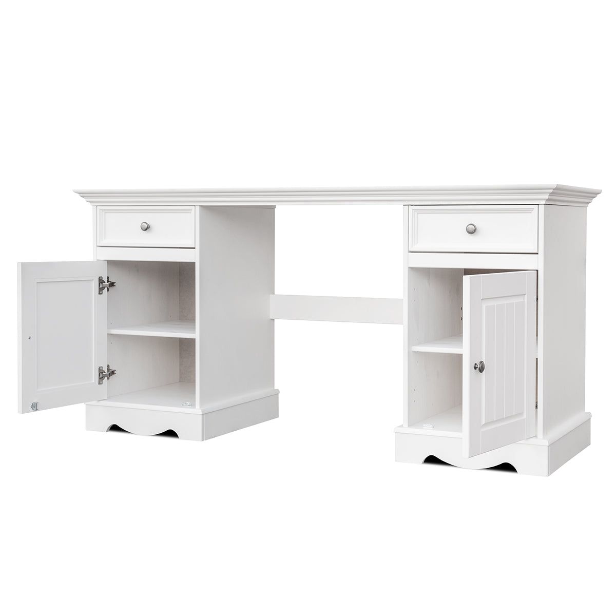 Dieser weiße Kiefernholz-Schreibtisch ist Teil der Bologna Elegante Möbelserie, die stilvolle Provence-Möbel für das Wohnzimmer, Schlafzimmer, Esszimmer und Homeoffice umfasst. Ergänzen Sie ihn mit einer passenden Kommode, einem Regal oder einem Stuhl, um eine stimmige Einrichtung zu schaffen.