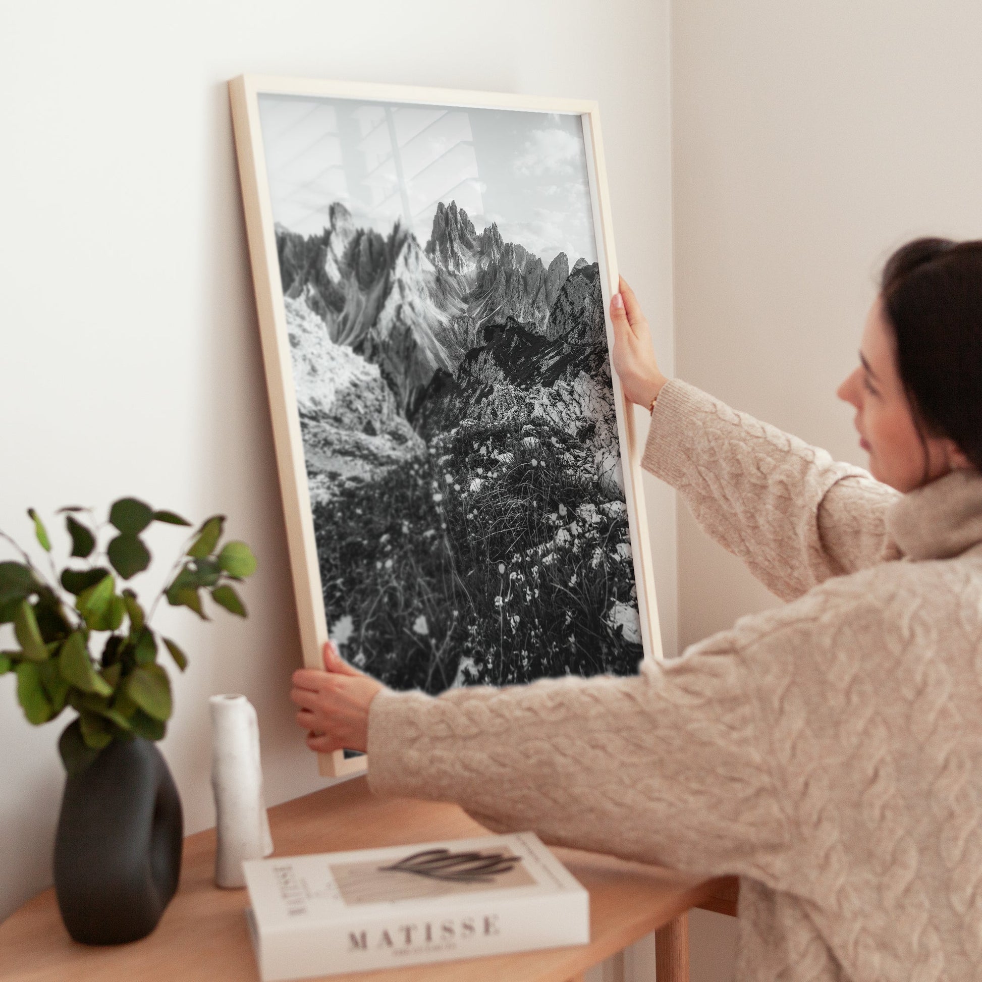A monochrome view of the dramatic Cadini di Misurina spires in the Italian Dolomites, captured from a quiet wildflower-lined ridge. This fine art print brings a timeless, high-contrast alpine presence to any space – perfect for neutral interiors or nature lovers drawn to sharp lines and striking textures.