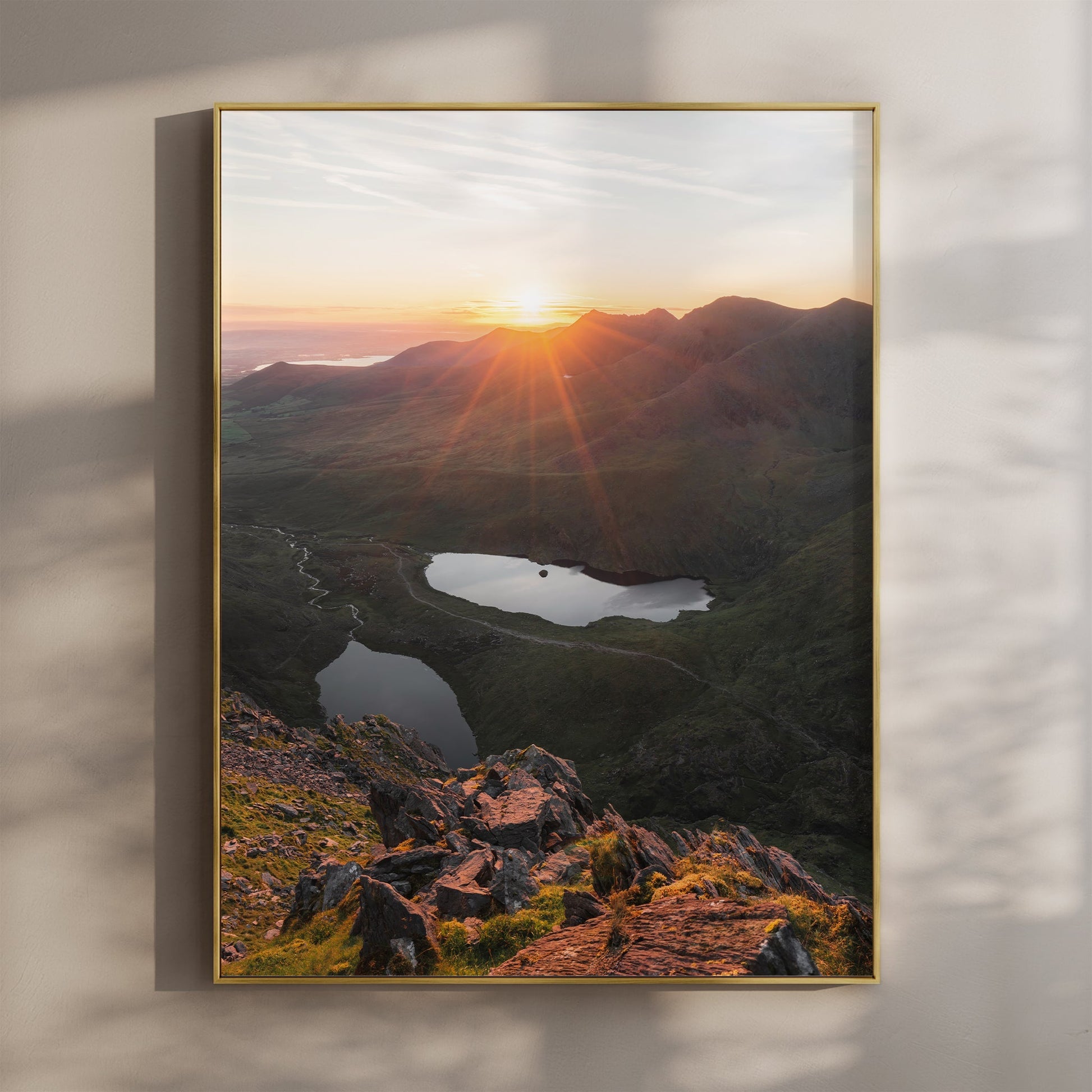 A breathtaking sunrise over Carrauntoohil, Ireland’s tallest mountain, captured from high above the MacGillycuddy’s Reeks. Golden light spills across rugged terrain, alpine lakes shimmer in the valley below, and the morning sky glows with promise. This fine art landscape print is for anyone who loves the wild beauty of Ireland or has stood at the top of the Emerald Isle.