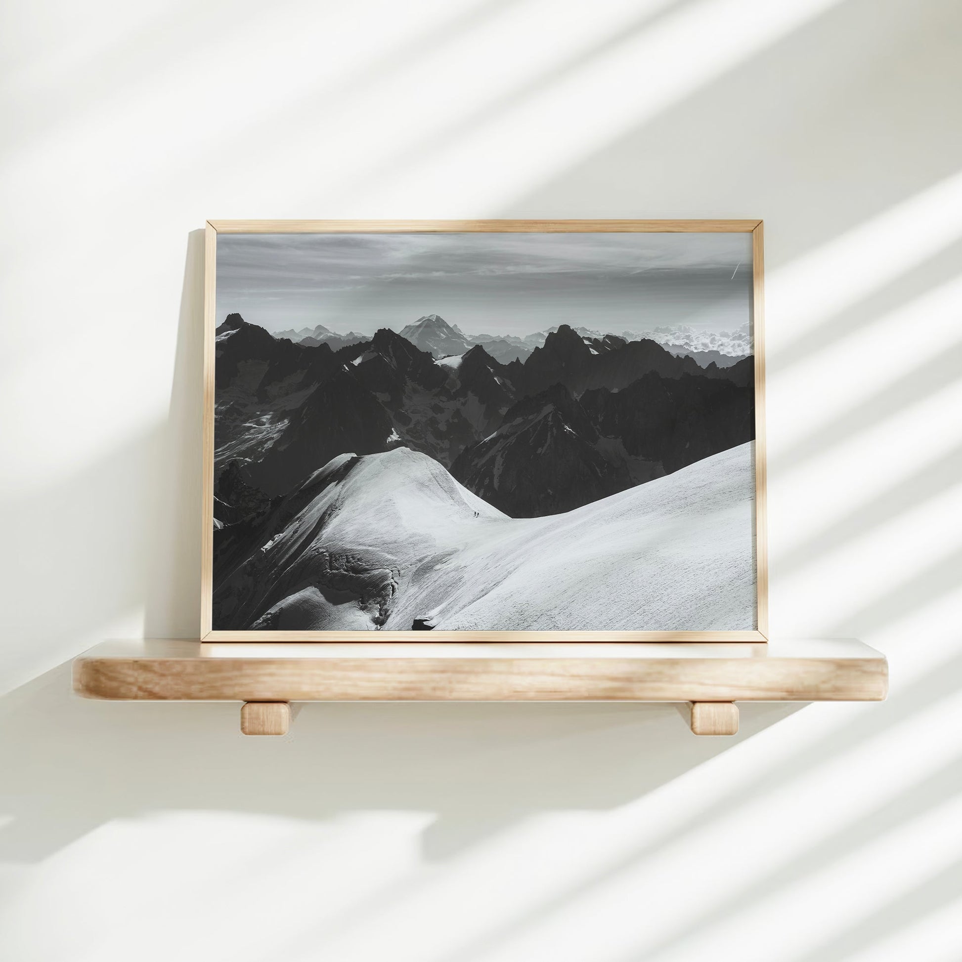 Bring the majesty of Chamonix's high alpine peaks into your home with this striking wall art print. Featuring two mountaineers embarking on their journey across the snowy ridges, this fine art photograph captures the essence of adventure and the allure of the mountains. Perfect for adding a touch of nature and inspiration to your living space, this piece is ideal for mountain lovers, adventurers, and anyone seeking unique decor.