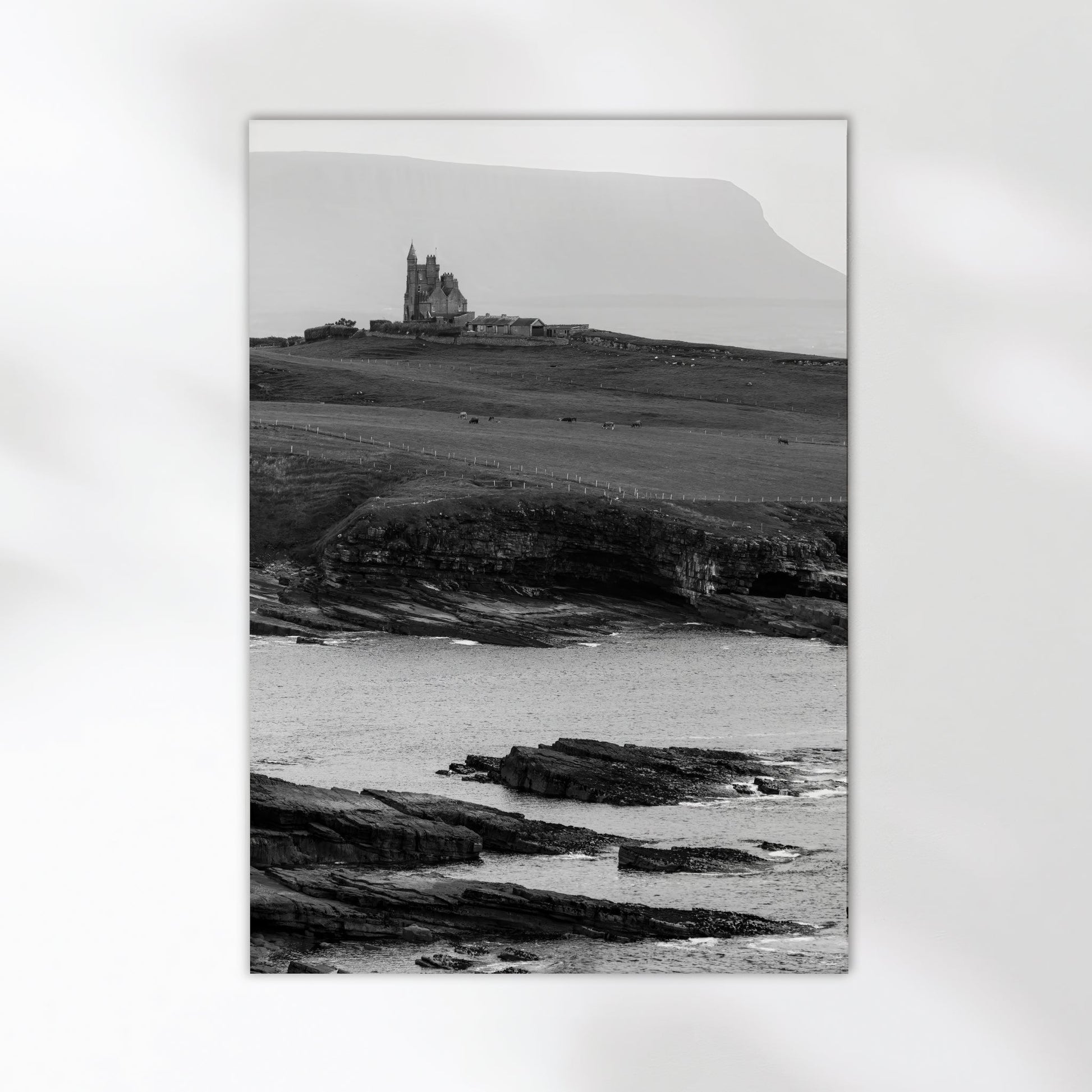 This beautiful black and white landscape print captures the rugged Irish coast with the majestic silhouette of Classiebawn Castle overlooking the Atlantic from Mullaghmore Head in County Sligo. With layered textures of cliffs, sea, and sky, this photograph blends natural drama with historic charm—perfect for minimalist or monochrome interiors.