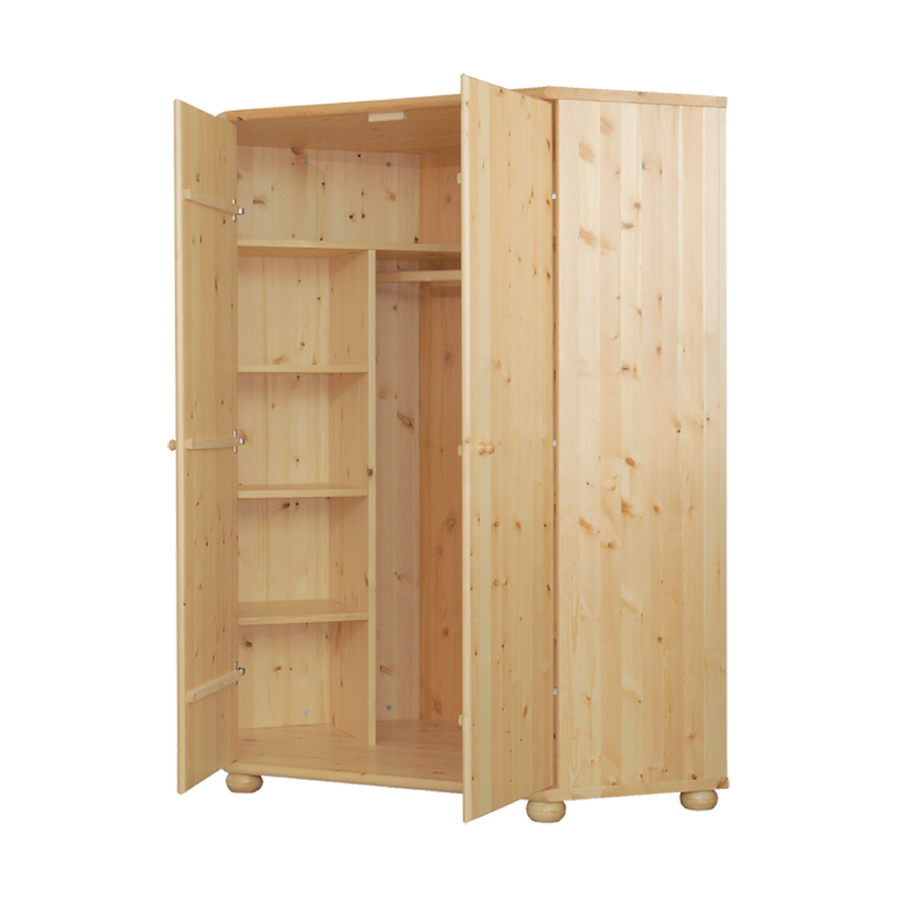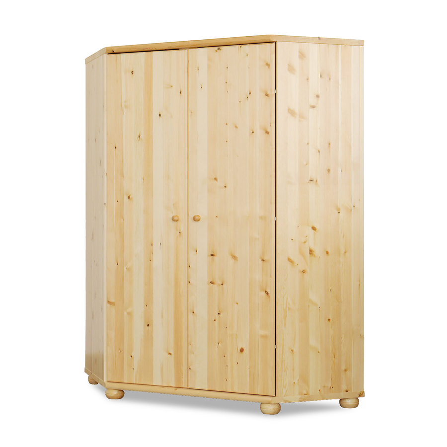 Dieser Eckkleiderschrank ist aus FSC-zertifiziertem finnischen Kiefernholz gefertigt – ein besonders robustes Material mit charakteristischer Maserung und langer Lebensdauer. Die Eco-Finish Glasur sorgt für eine angenehm glatte Oberfläche und schützt das Holz vor äußeren Einflüssen.