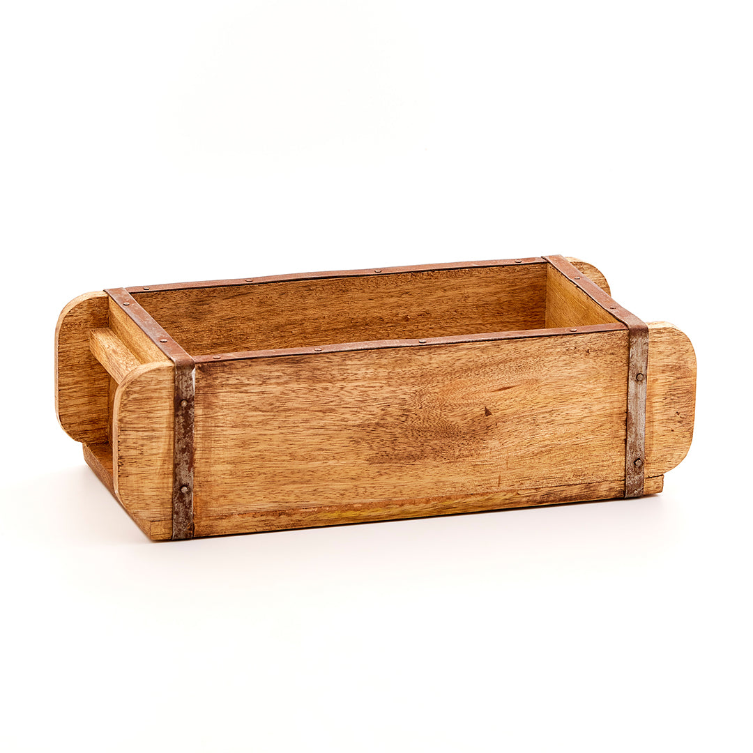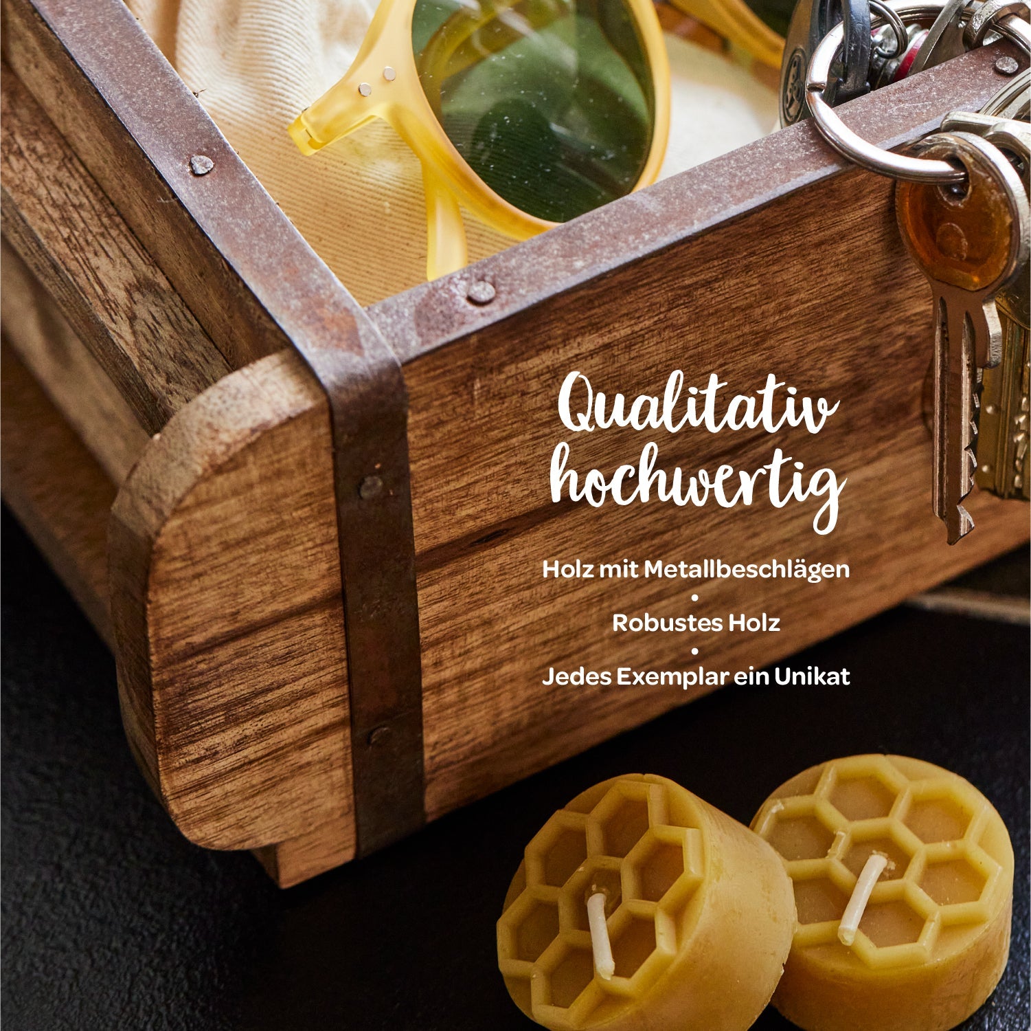 Details: Länge 32 cm, Breite 14 cm, Höhe 9,5 cm | Material: Holz mit Metallbeschlägen