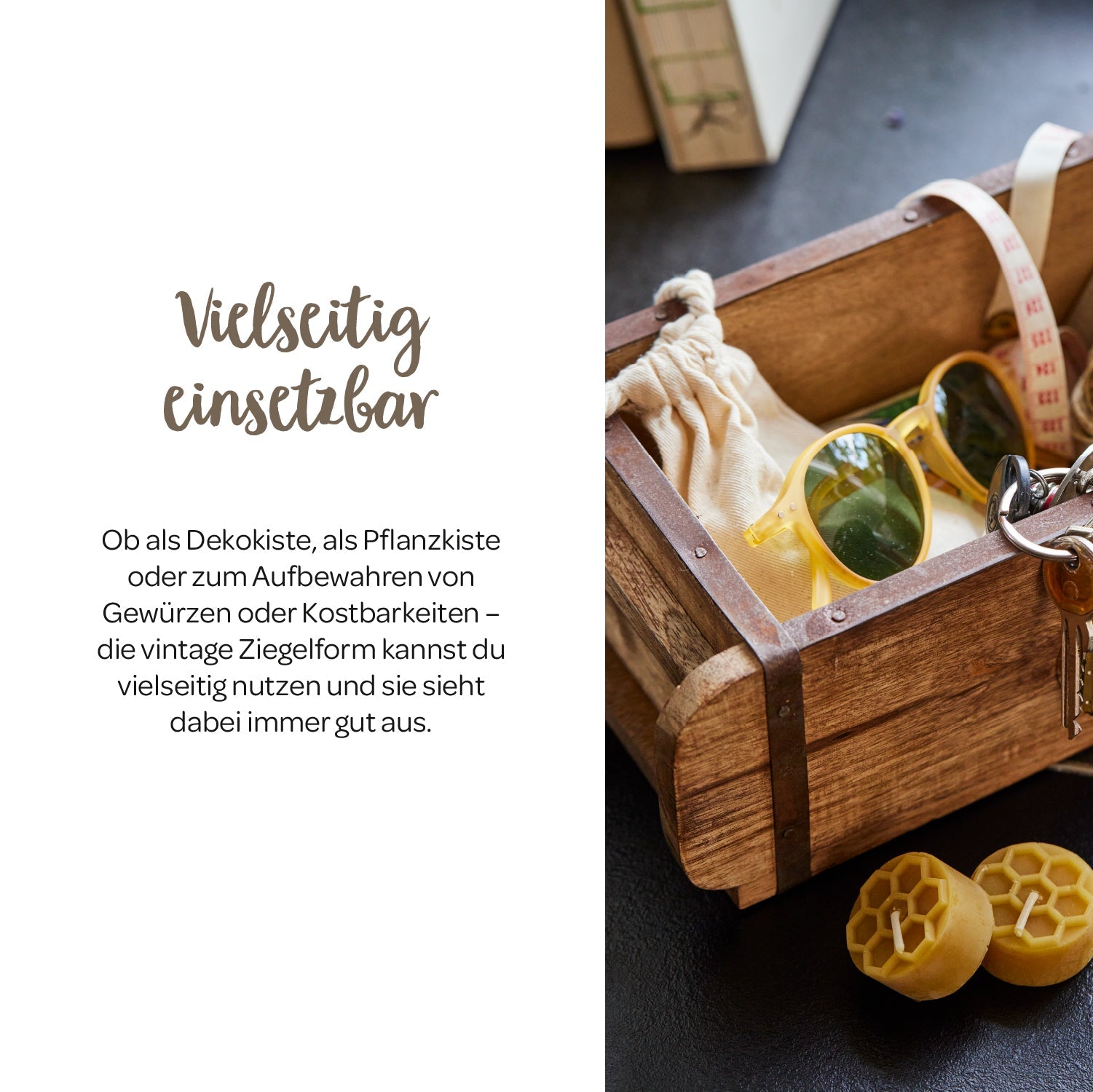 Vielseitig einsetzbar: Ob als Dekokiste, als Pflanzkiste oder zum Aufbewahren von Gewürzen oder Kostbarkeiten – die vintage Ziegelform kannst du vielseitig nutzen und sie sieht dabei immer gut aus.