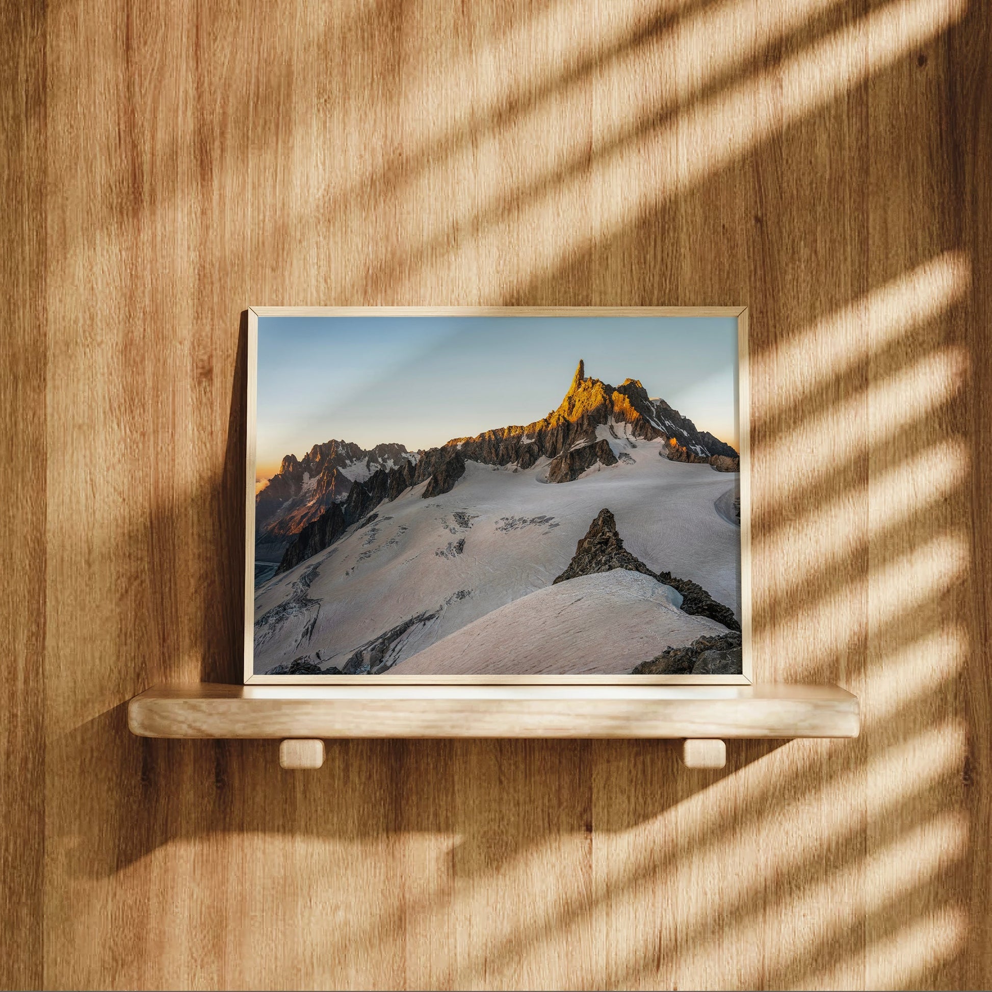 Capture the breathtaking beauty of the Dent du Géant during golden hour with this premium photography print. Perfect for mountain lovers, this wall art adds a touch of nature's grandeur to any home decor.