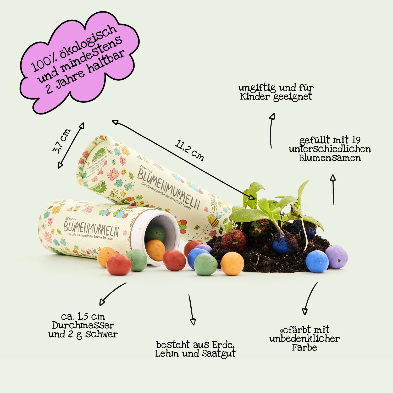 Unsere neuen Seedbombs sind nicht mehr einfach nur braun, sondern kommen in kunterbunten Farben daher. Von der ersten Sekunde an sind sie dazu da, deine Welt ein bisschen bunter zu machen. Einfach auswerfen, (auf den nächsten Regen) warten und freuen! In kurzer Zeit wachsen aus den bunten Murmeln kunterbunte Blumen heran.