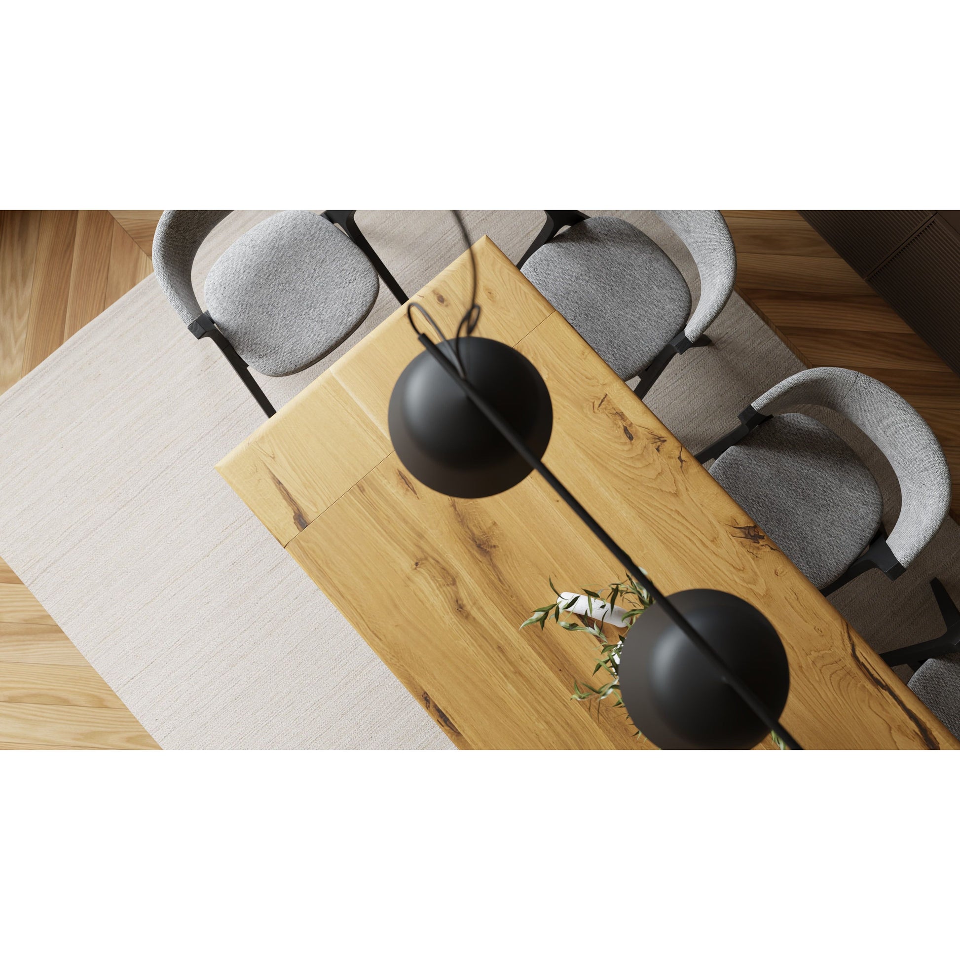 Dieser Esstisch verbindet moderne Form mit hochwertiger Verarbeitung. Das natürliche Eichenholz sorgt für warme, harmonische Akzente, während das schwarze Metallgestell dem Möbelstück eine klare, zeitlose Note verleiht. Die integrierten Ansteckplatten ermöglichen es, problemlos zusätzlich Platz zu schaffen – ideal für spontane Gäste oder besondere Anlässe.
