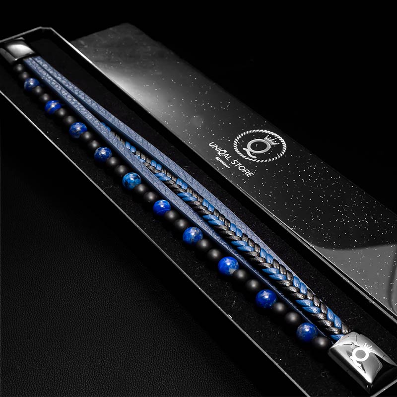 Fancy Lapis Lazuli Lederarmband Unisex – ein hochwertiges Schmuckstück, das Stil, Bedeutung und Alltagstauglichkeit vereint. Gefertigt aus echtem schwarzen Rindleder, authentische Lapis Lazuli Natursteinperlen und schwarze Akzentperlen sorgen für eine kühne, dennoch elegante Optik. Einer der drei Stränge ist kunstvoll geflochten und setzt ein markantes Highlight.