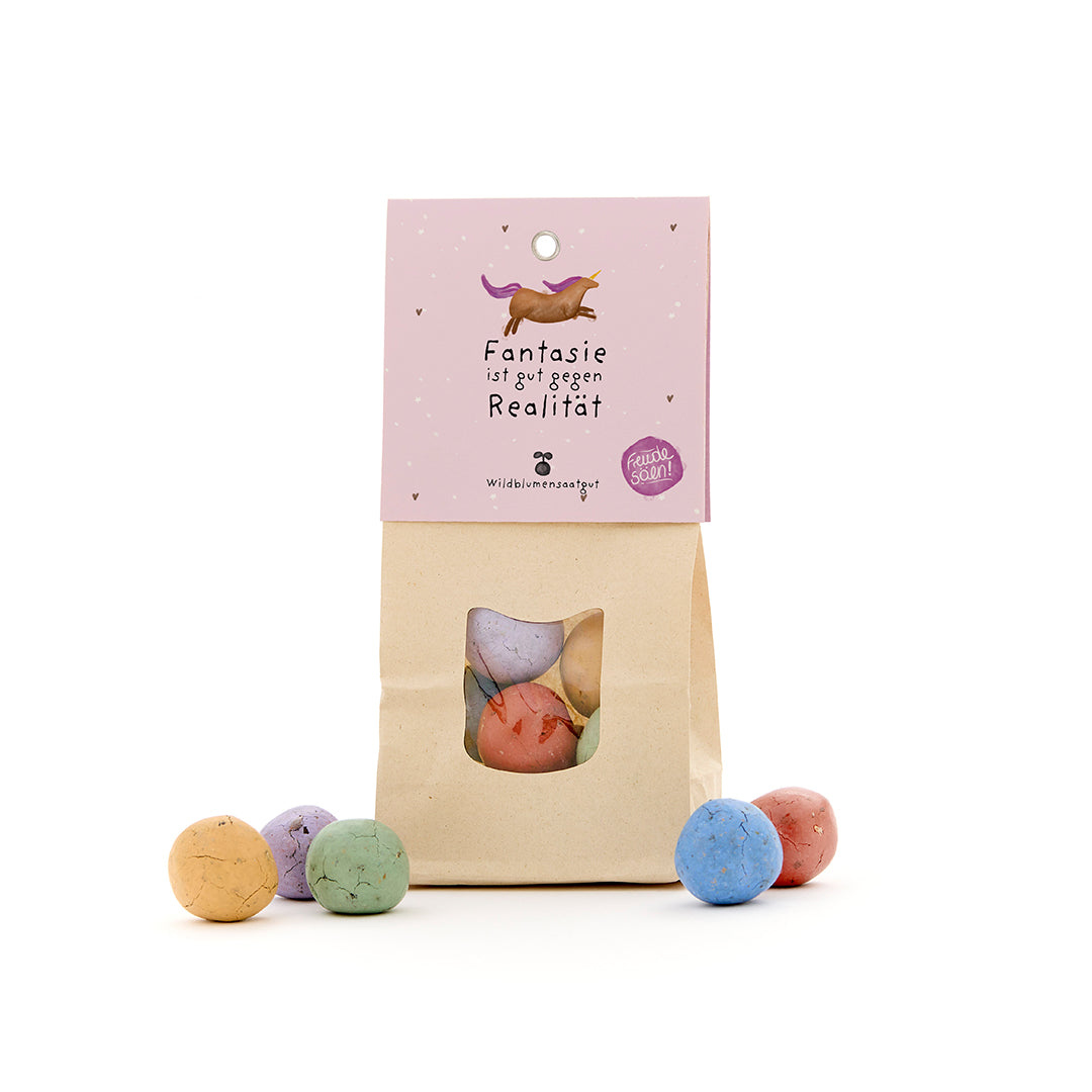 Lass Blumen sprechen: Diese zauberhafte Geschenkidee mit 8 Wildblumen-Saatkugeln ist eine Einladung, den Alltag kurz hinter sich zu lassen. Verpackt in einem liebevoll gestalteten Tütchen mit Einhorn-Motiv schenken die Kugeln mehr als nur bunte Wildblumen – sie schenken ein Lächeln, Farbe und einen Hauch Magie.