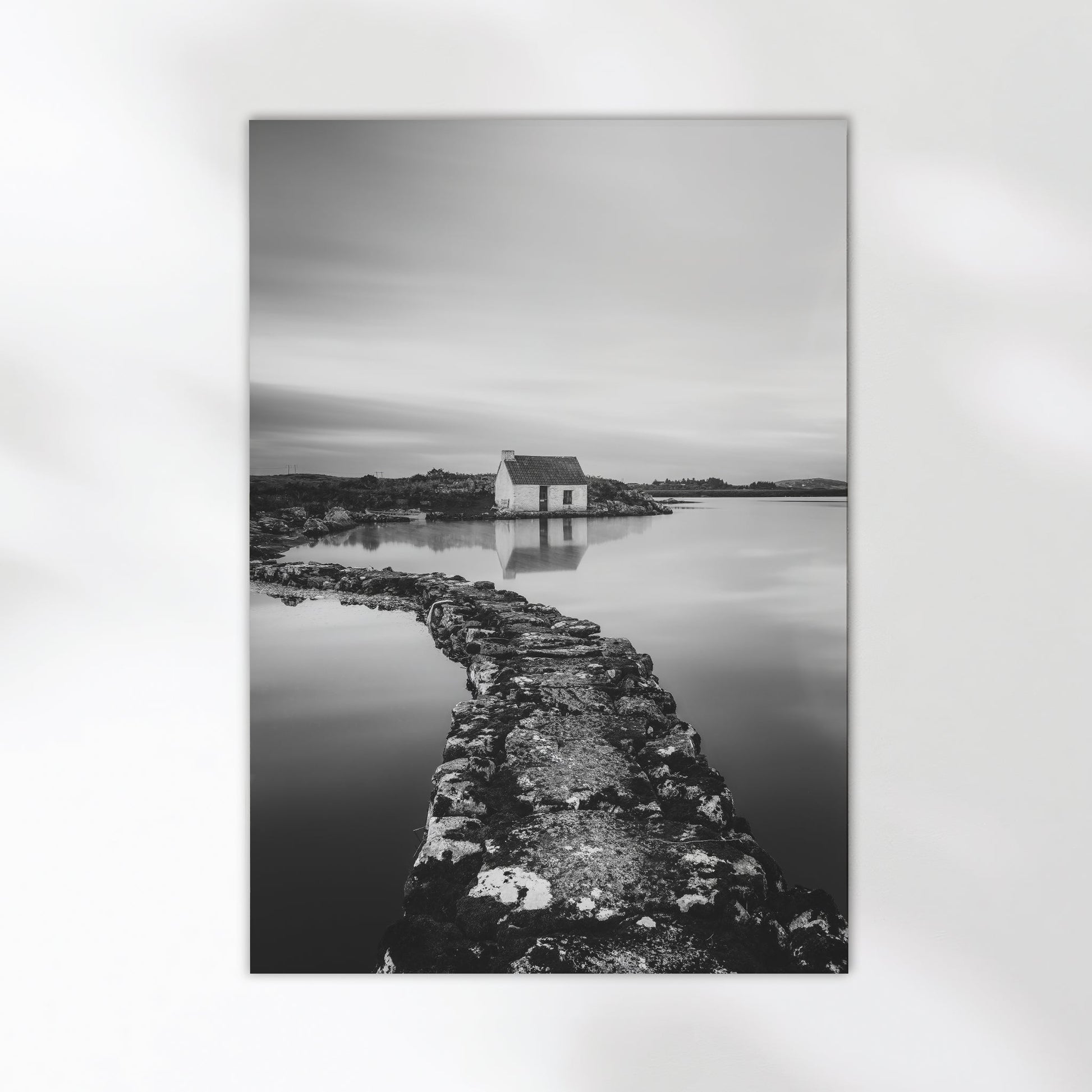 A quiet stone path leads to a lone fisherman’s bothy in Connemara, County Galway — captured in peaceful stillness. This black and white wall art print highlights the solitude and beauty of the Irish west coast. Ideal for lovers of Ireland, calm interiors, and minimalist art.