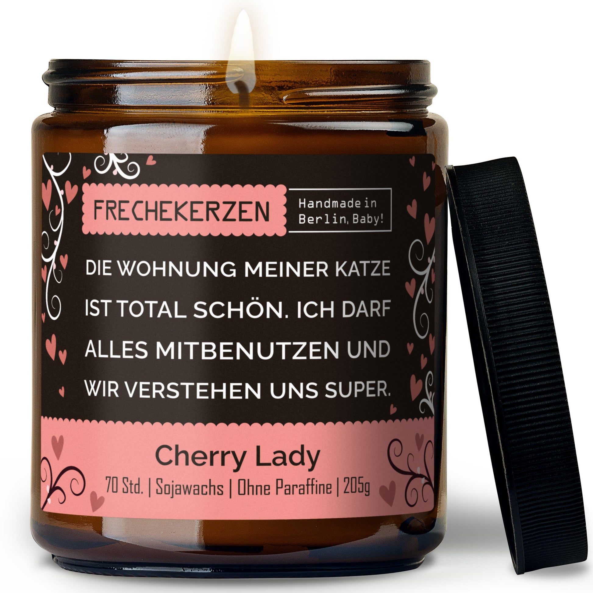 Erleben Sie Duftgenuss mit einer Prise Humor – die Original FRECHEKERZEN® Duftkerze im Glas mit Spruch bringt Duft, Stil und Katzenliebe direkt in Ihr Zuhause. Der Spruch lautet: die wohnung meiner katze ist total schön. ich darf alles mitbenutzen und wir verstehen uns super. -