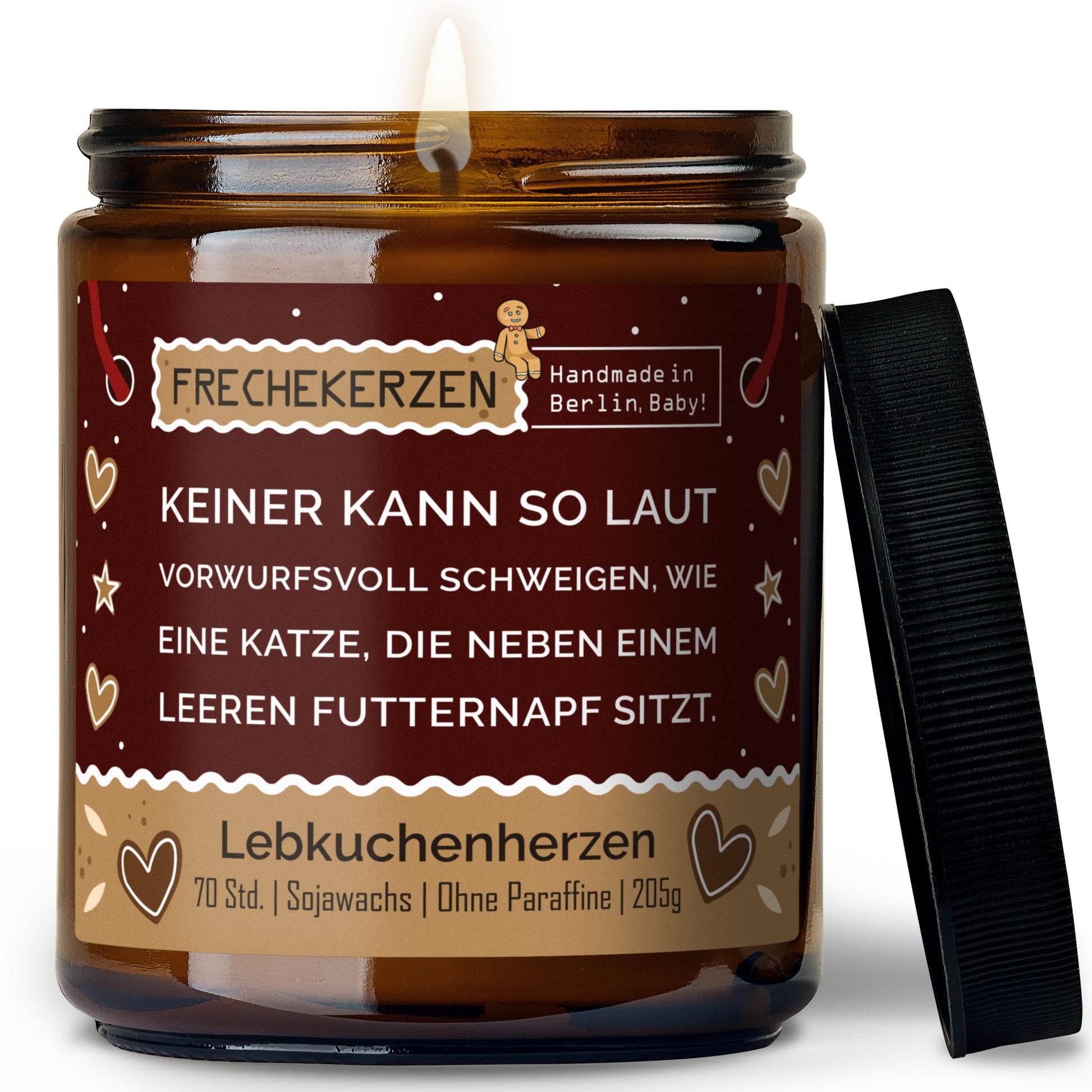 Erleben Sie die FRECHEKERZEN® Duftkerze im Glas – eine witzige Kombination aus duftender Kulisse und frechem Spruch. Original FRECHEKERZEN® Duftkerze im Glas mit Spruch: „Keiner kann so laut vorwurfsvoll schweigen, wie eine Katze neben einem leeren Futternapf sitzt.“ Diese Duftkerze ist mehr als Dekoration: Sie bringt einen humorvollen Blickfang in Ihr Zuhause und erfüllt den Raum mit einem angenehmen Duft, der für eine gemütliche Atmosphäre sorgt. Ideal für Wohnzimmer, Schlafzimmer oder das Büro, wenn Sie einen spritzigen Akzent setzen möchten. -