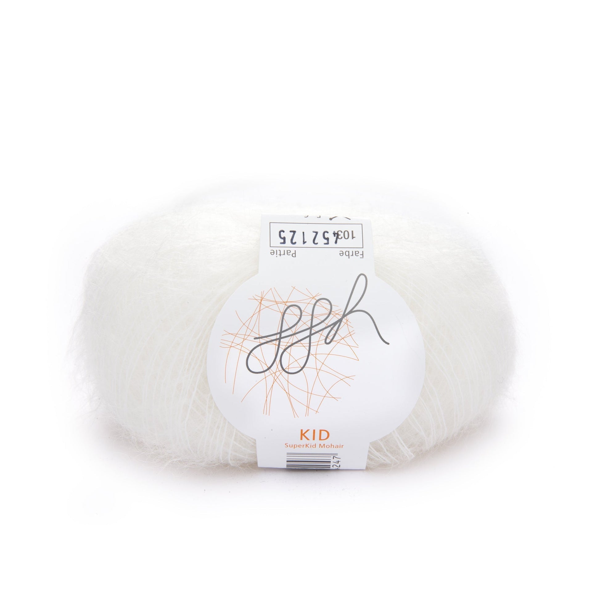 ggh Kid ist ein edles Lacegarn aus 65% Super-Kid-Mohairwolle, 5% Schurwolle und 30% Polyamid. Die Super-Kid-Mohairfaser ist besonders fein und verleiht dieser Mohairwolle ihre außergewöhnliche Leichtigkeit und den weichen, flauschigen Charakter. In der Farbe 103 - Weiß wirkt das Garn elegant und zeitlos – ideal für klassische Strickprojekte, die du lange lieben wirst. Mit nur ca. 150g lässt sich bereits ein Pullover stricken, der kaum spürbar auf der Haut liegt und gleichzeitig wunderbar wärmt.