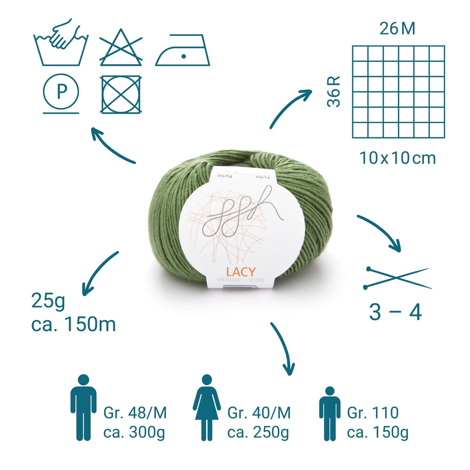 Lauflänge: 150m/25g | Maschenprobe: 36 Reihen, 26 Maschen | Verbrauch: ca. 250g (Größe M)