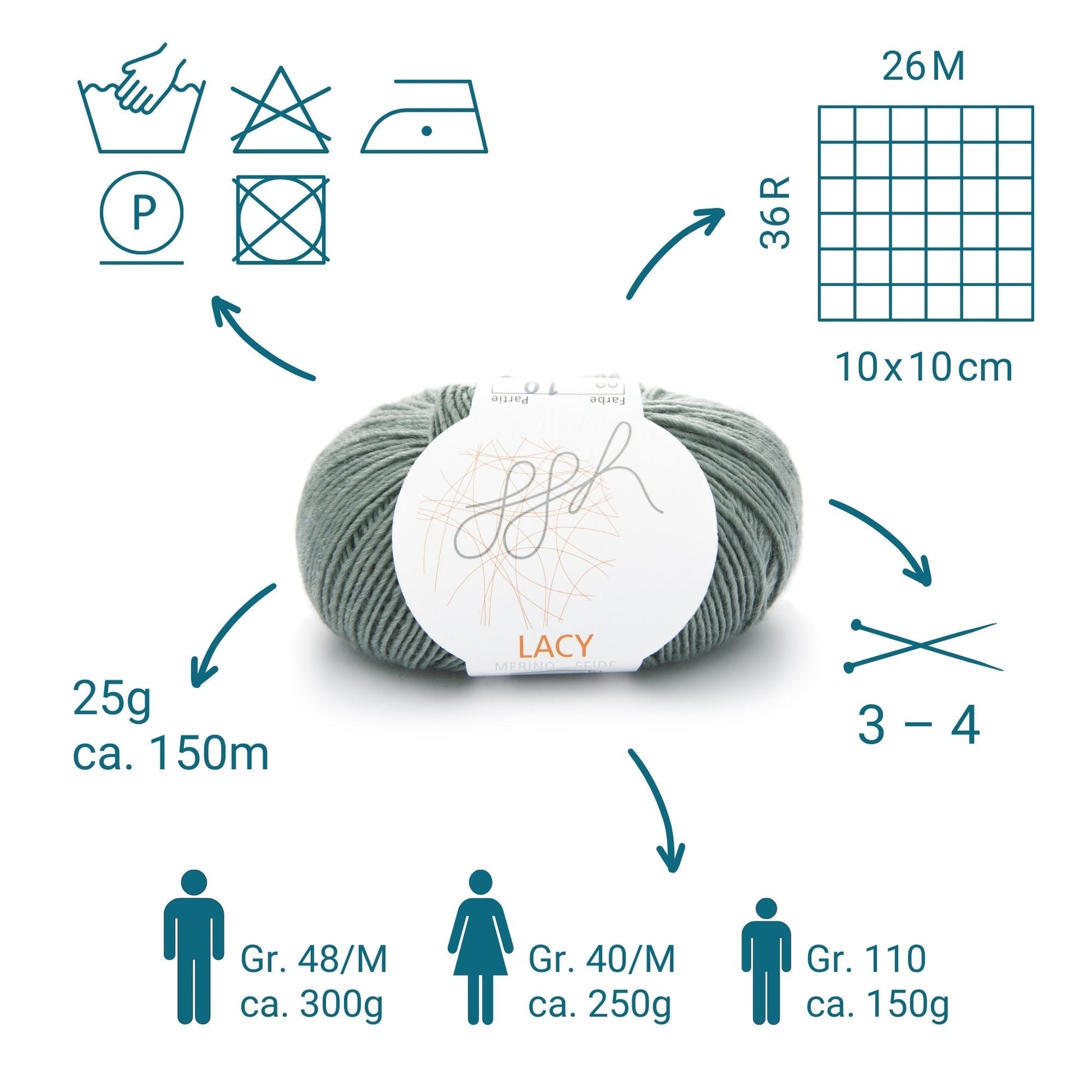 Lauflänge: 150m/25g | Maschenprobe: 36 Reihen, 26 Maschen | Verbrauch: ca. 250g (Größe M)