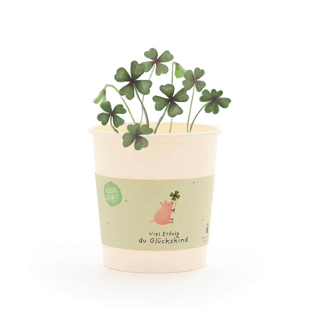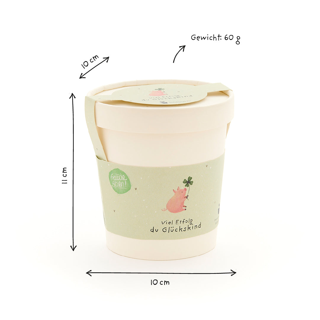 | Verschenke einen Hauch von Glück: Dieses liebevoll gestaltete Anzuchtset für Glücksklee sagt mehr als tausend Worte: Es schenkt Mut, Glück und ein Lächeln – mit einem Becher, der zeigt, wie viel man jemandem wünscht. Der Spruch „Viel Erfolg, du Glückskind“ macht daraus ein kleines, aber bedeutungsvolles Geschenk. Alles drin für sprießenden Glücksklee: Das Set enthält Glücksklee-Saatgut, eine Kokos-Quelltablette, einen Anzuchtbecher und eine Anleitung. Schon bald wächst ein zarter Klee heran – Symbol für Glück, Neuanfang und Zuversicht. Ideal für Fensterbank, Büro oder Balkon. Ein Geschenk für große & kleine Meiliensteine: Ob zum Schulabschluss, zur Prüfung, für den Studienstart, den neuen Job, zum Umzug oder einfach zur Aufmunterung – dieser grüne Glücksbringer ist das perfekte Mitbringsel für Menschen, die du stärken und motivieren möchtest. Ideal für Freunde, Familie, Schüler, Studenten und Herzensmenschen. Nachhaltig: Der Becher besteht aus umweltfreundlichem Material, die Verpackung ist vollständig plastikfrei. Ein Geschenk, das nicht nur Glück bringt, sondern auch die Umwelt respektiert. | Regulärer Preis