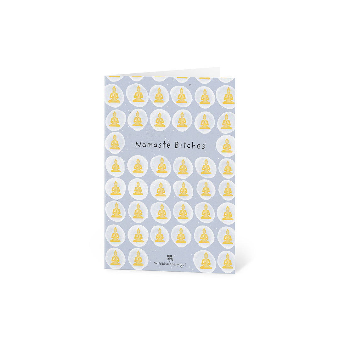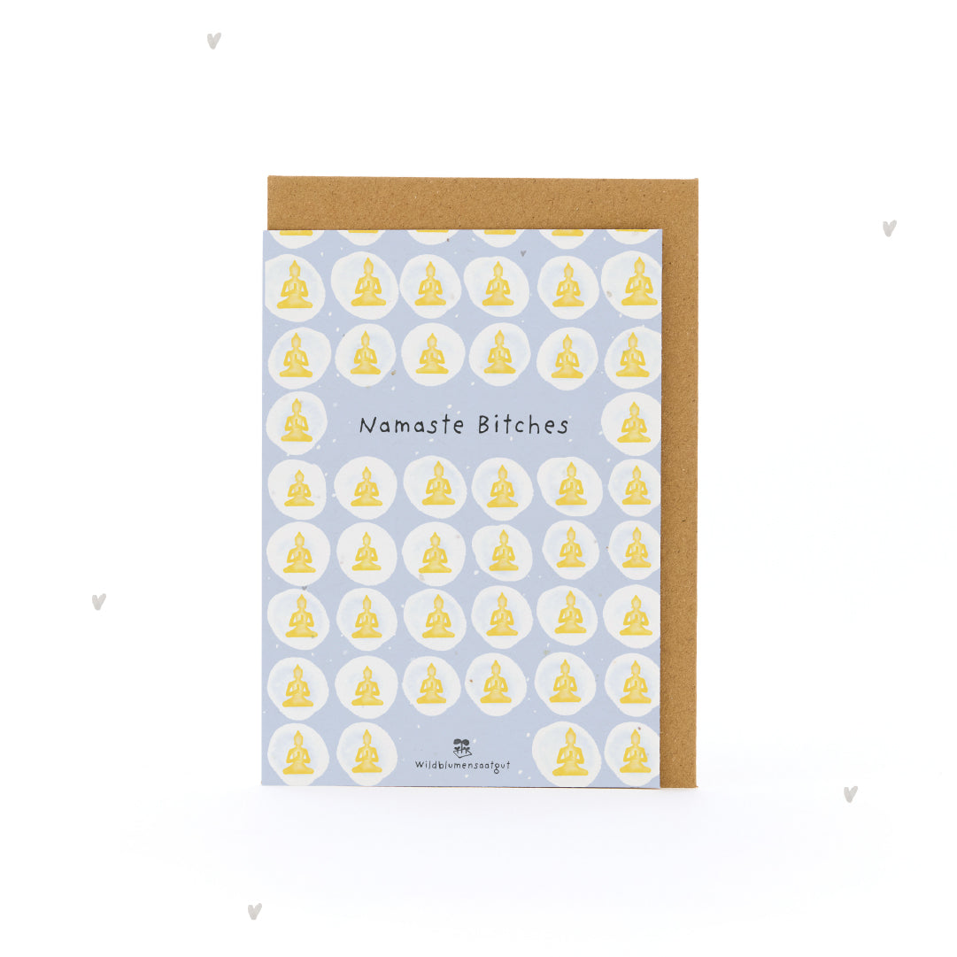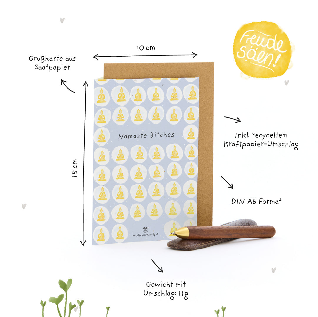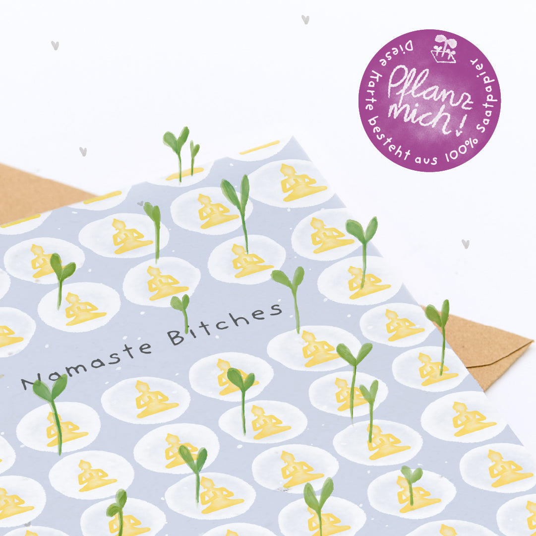 Namaste - mit einem Augenzwinkern: Diese Karte ist eine liebevolle Verbeugung vor deiner Bestie, Yoga-Freundin oder einem Herzensmenschen - perfekt zum Geburtstag, fürs Yoga-Retreat, den Mädelsabend oder einfach so. "Namaste Bitches" sagt auf spielerische Weise: Ich schätze dich. Und du bringst Licht, Liebe und eine ordentliche Portion Spaß in mein Leben.