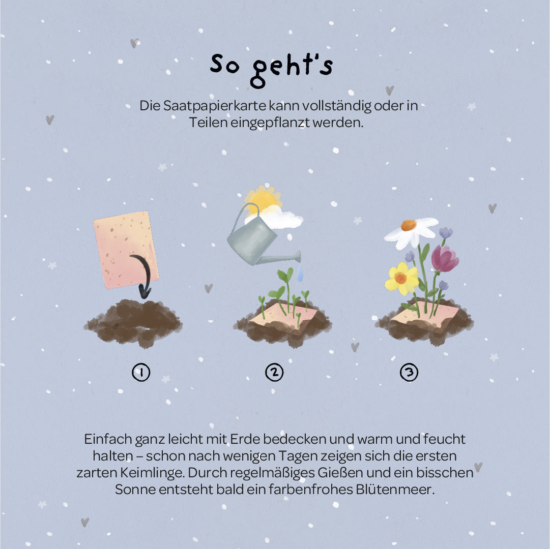 Einfach einpflanzen: Die Karte kann im Ganzen oder in Stücke gerissen eingepflanzt werden. Leicht mit Erde bedecken & feucht halten - schon bald zeigt sich ein buntes Blütenmeer, das eure Freundschaft wortwörtlich zum blühen bringt.
