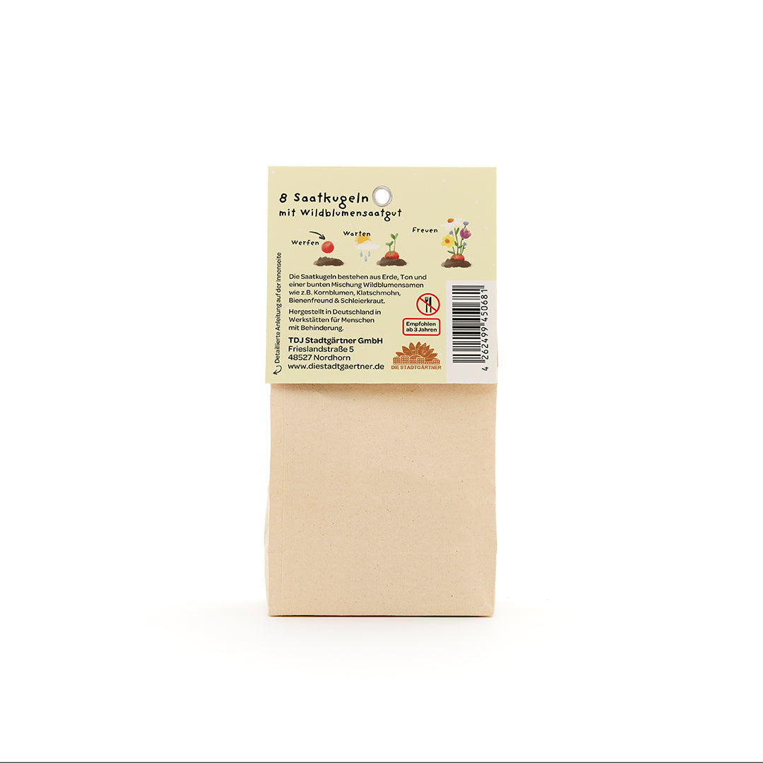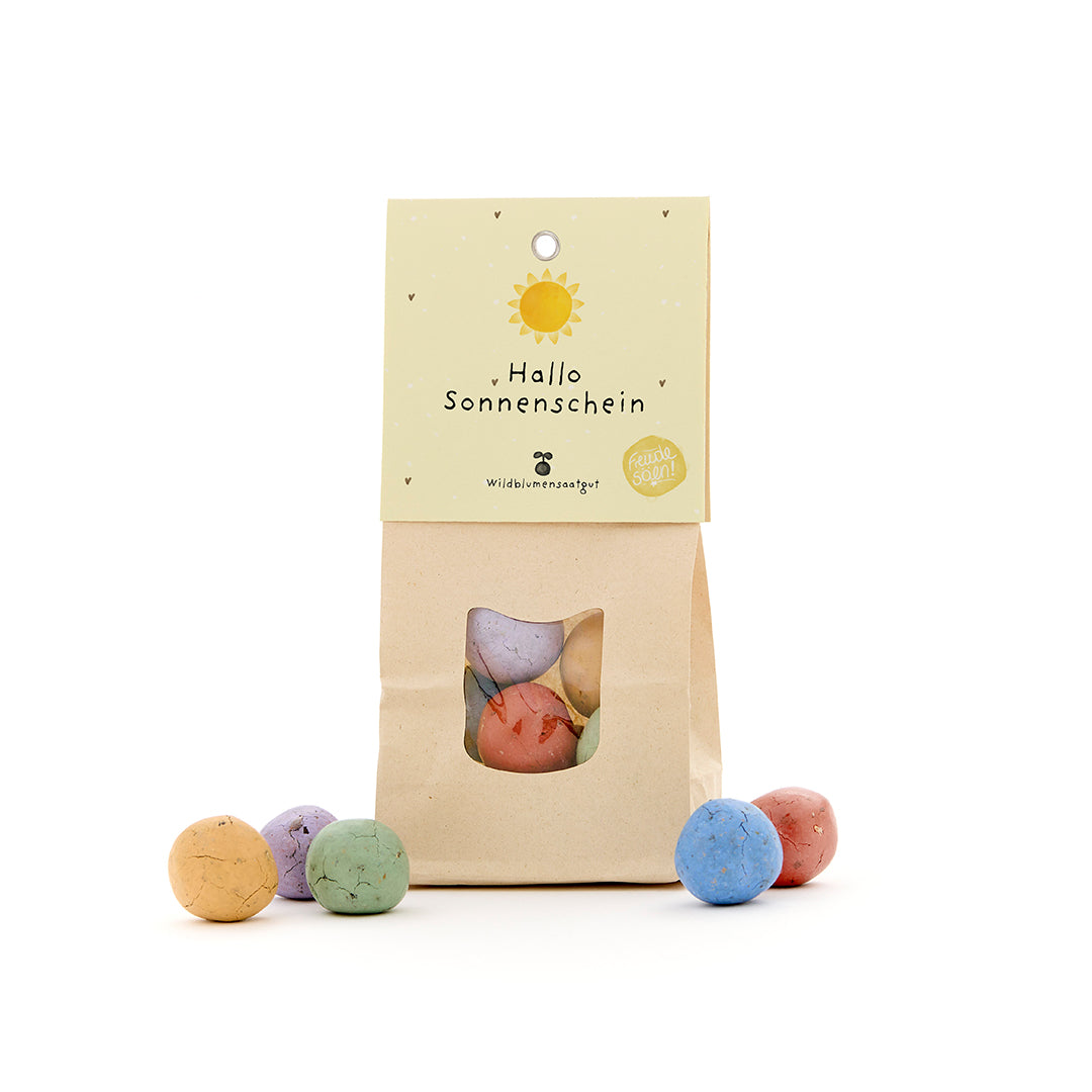 Sonnenschein für Herz und Seele: Die Saatkugeln enthalten eine fröhlich bunte Wildblumenmischung, die ganz einfach ausgebracht werden kann – im Garten, auf dem Balkon oder im Topf. Mit ein wenig Wasser entsteht ein kleines Blütenmeer, das den Tag heller macht.
