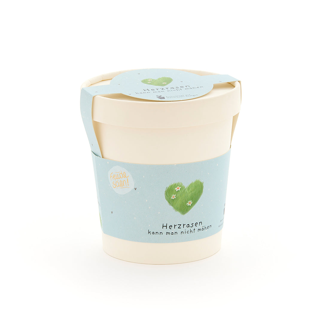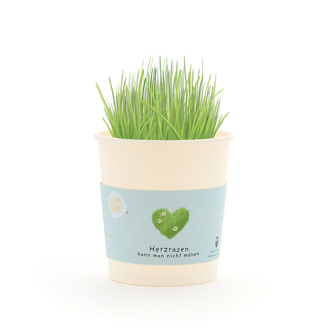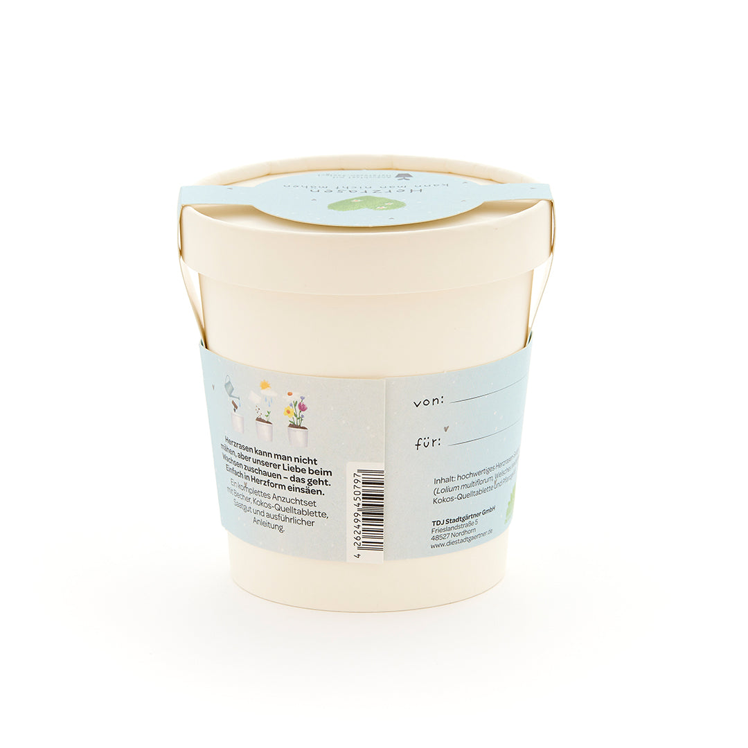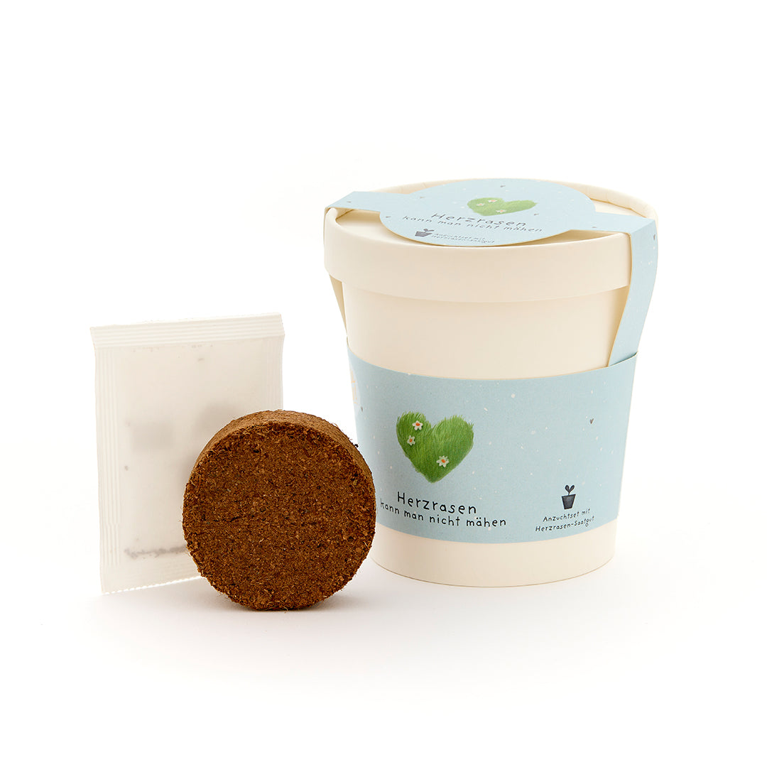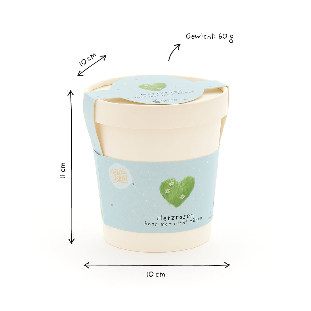 Alles drin für grünes Herzklopfen: Das Set enthält Herzrasen-Saatgut (Welsches Weidelgras), eine Kokos-Quelltablette, einen Anzuchtbecher und eine Anleitung. In nur wenigen Schritten wächst aus dem Set ein grüner Liebesgruß – auf der Fensterbank, im Büro oder auf dem Balkon.