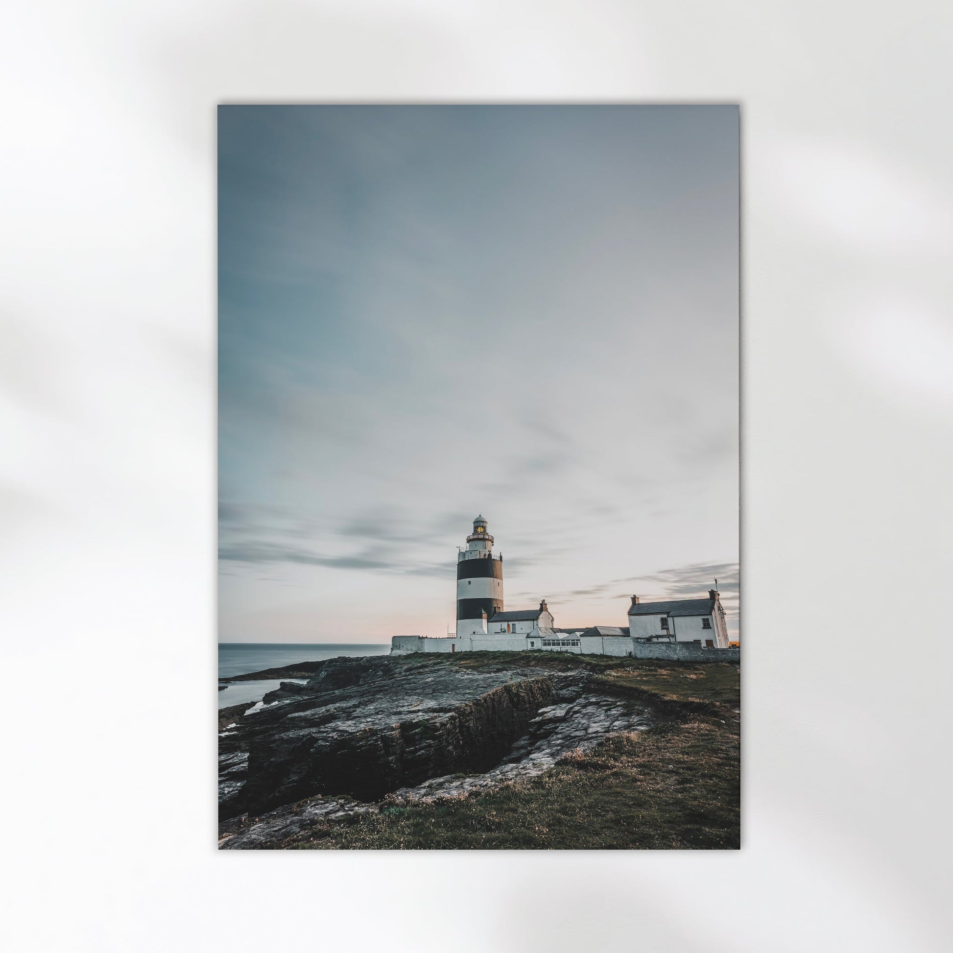 A peaceful long exposure of Ireland’s iconic Hook Head Lighthouse, photographed in soft coastal light as the sun dips toward the horizon. The muted blue sky contrasts with the rough textures of the rocky Wexford coast, captured in timeless detail.