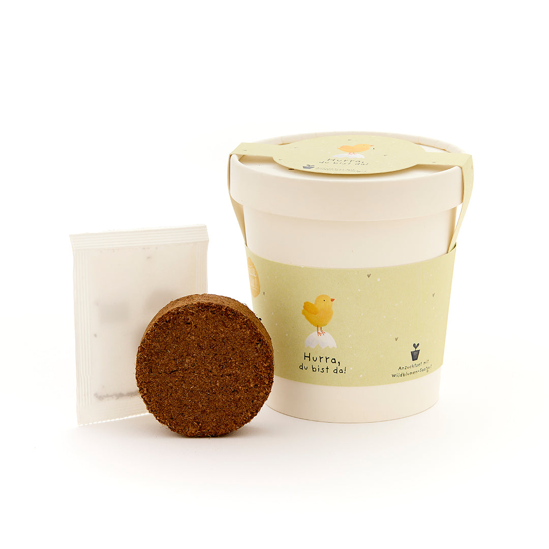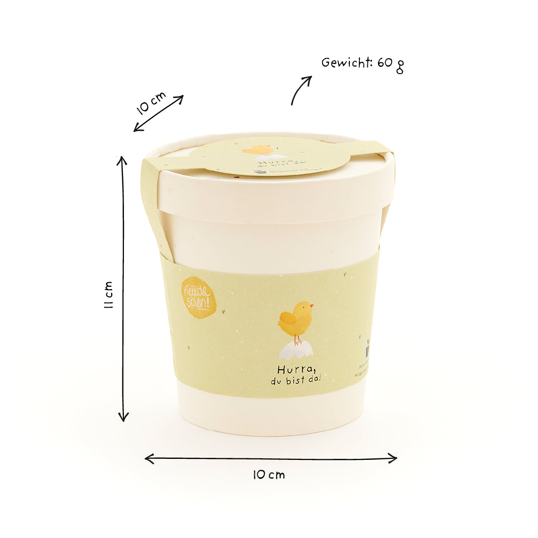 Hurra, du bist da – ein blühender Willkommensgruß zur Geburt: Dieses herzliche Wildblumen-Anzuchtset ist eine ganz besondere Geste zur Begrüßung eines neuen Lebens. Der liebevoll gestaltete Becher mit dem niedlichen Küken-Motiv und dem Spruch „Hurra, du bist da“ schenkt frischgebackenen Familien eine farbenfrohe Erinnerung, die mitwächst.