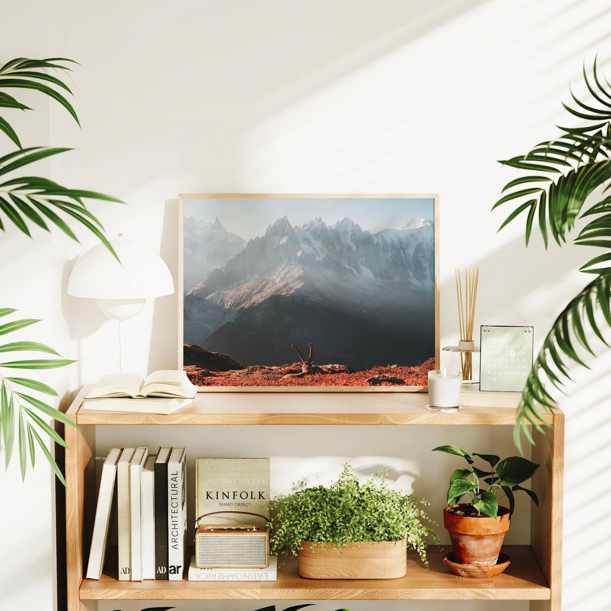 Bring the majestic beauty of the Alps into your home with this stunning wall art print featuring an ibex at sunrise against the backdrop of Mont Blanc. Perfect for nature lovers and mountain enthusiasts, this high-quality print captures a serene moment in the Chamonix mountains.