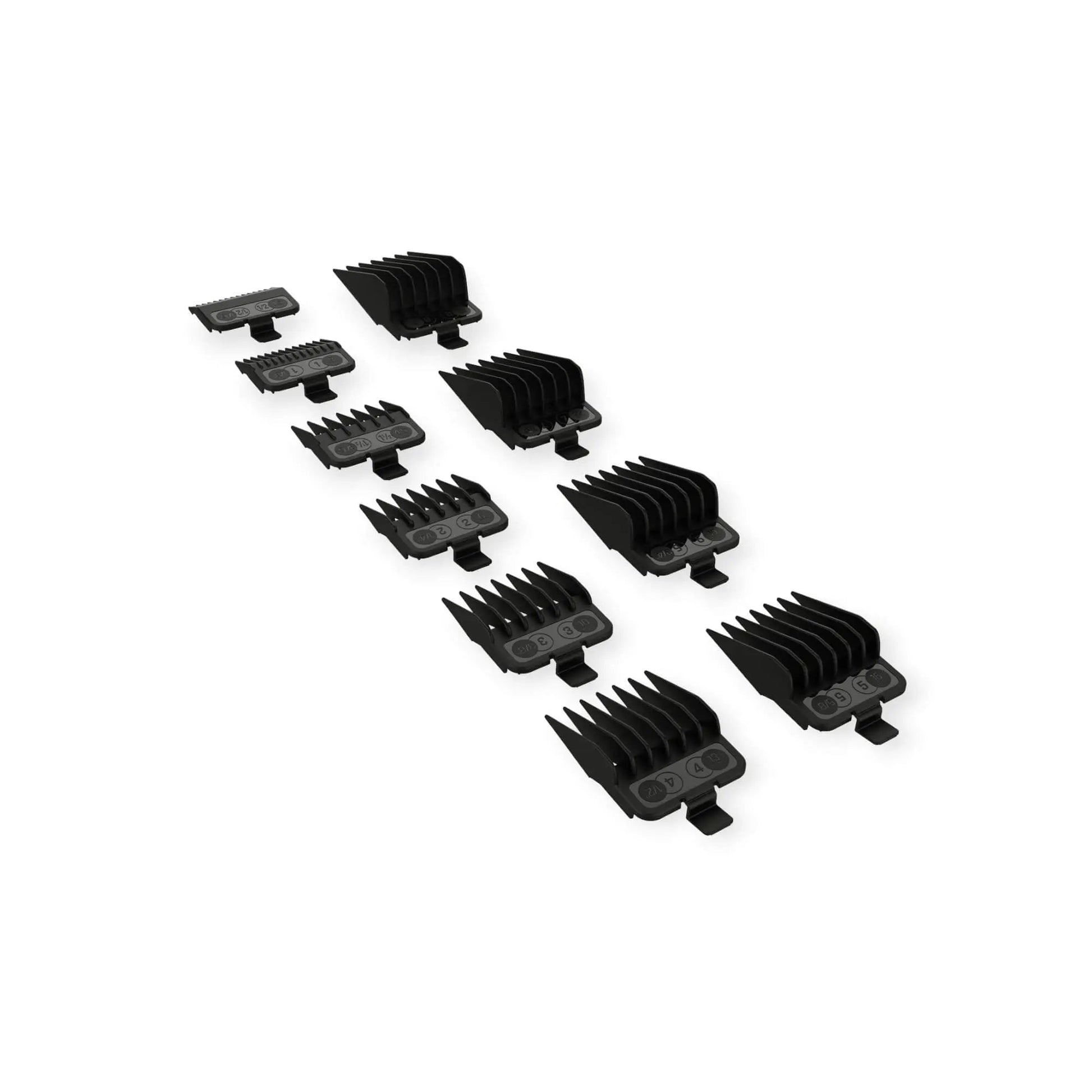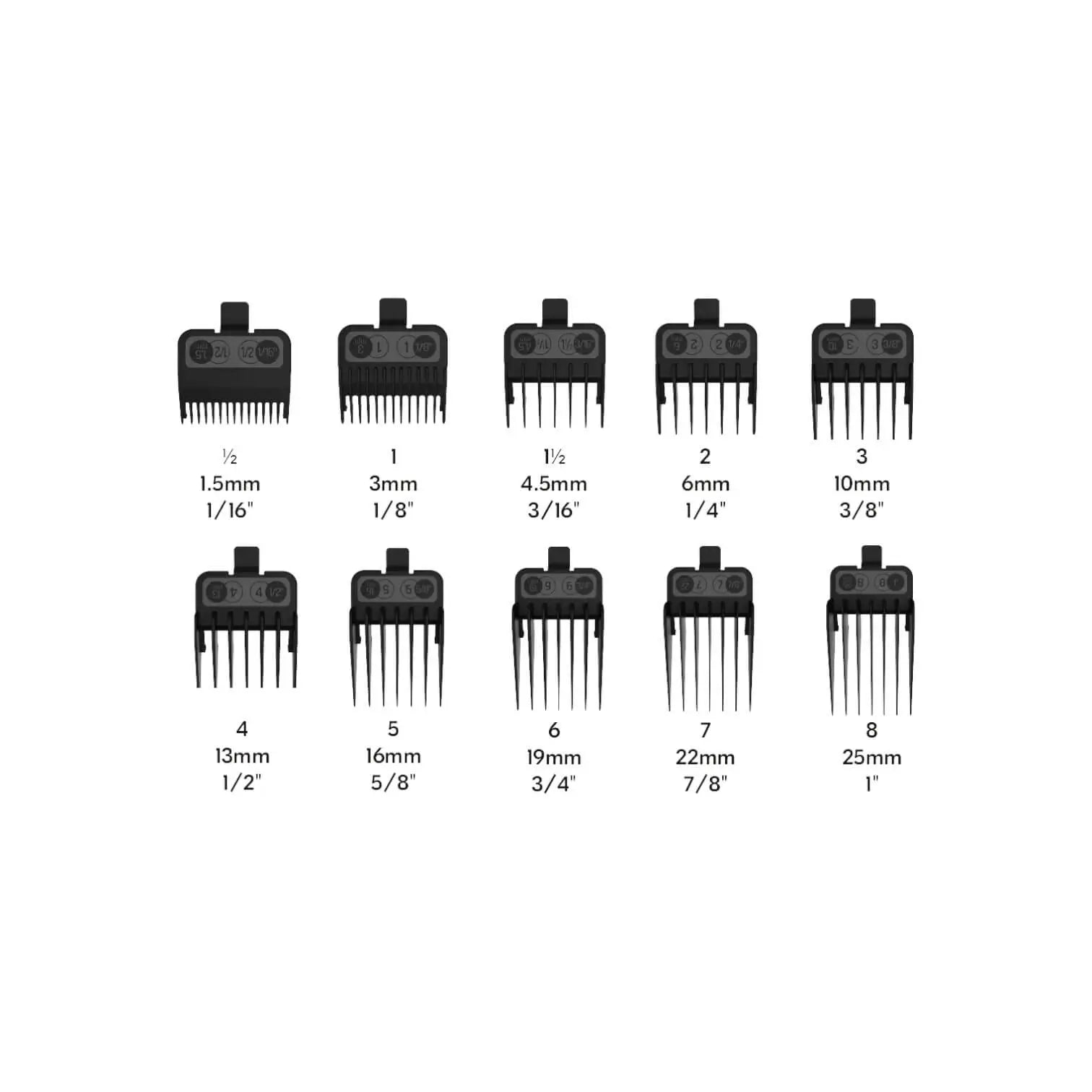 Das JRL FF 2020C Standard 10-Pack Cutting Guards Set bietet eine umfassende Auswahl an Aufsteckkämmen für professionelle Friseure und Barber, die auf das Modell FF 2020C abgestimmt sind. Jeder Aufsteckkamm in diesem Set ist präzise gefertigt, um eine genaue Längeneinstellung von 1,5 mm (1/16") bis 25 mm (1") zu ermöglichen, was eine große Vielfalt an Schnittlängen für individuelle Kundenwünsche erlaubt.