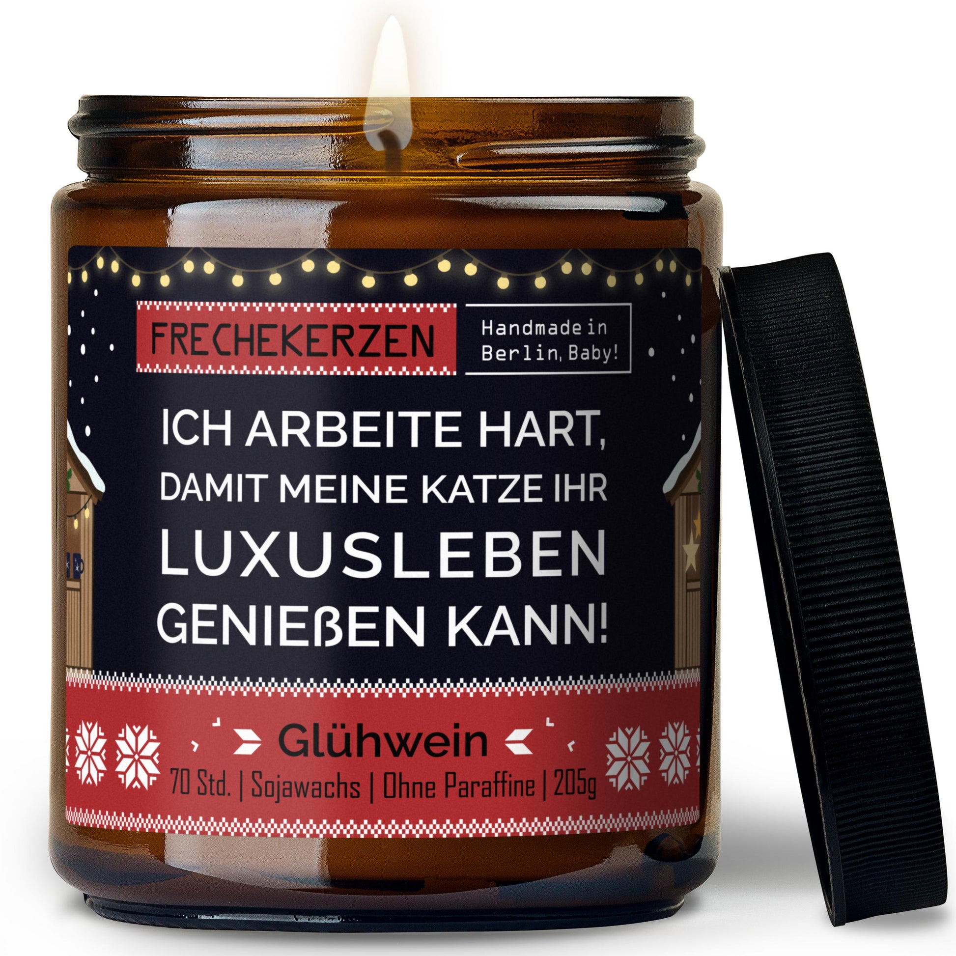 Entdecken Sie die Original FRECHEKERZEN® Duftkerze im Glas – mit einem frechen Spruch, der gute Laune garantiert: „ich arbeite hart, damit meine katze ihr luxusleben genießen kann!“. Diese Duftkerze verbindet Humor mit einem angenehmen Duft und macht Ihre Räume zu einer stilvollen Bühne für Katzenliebhaber.