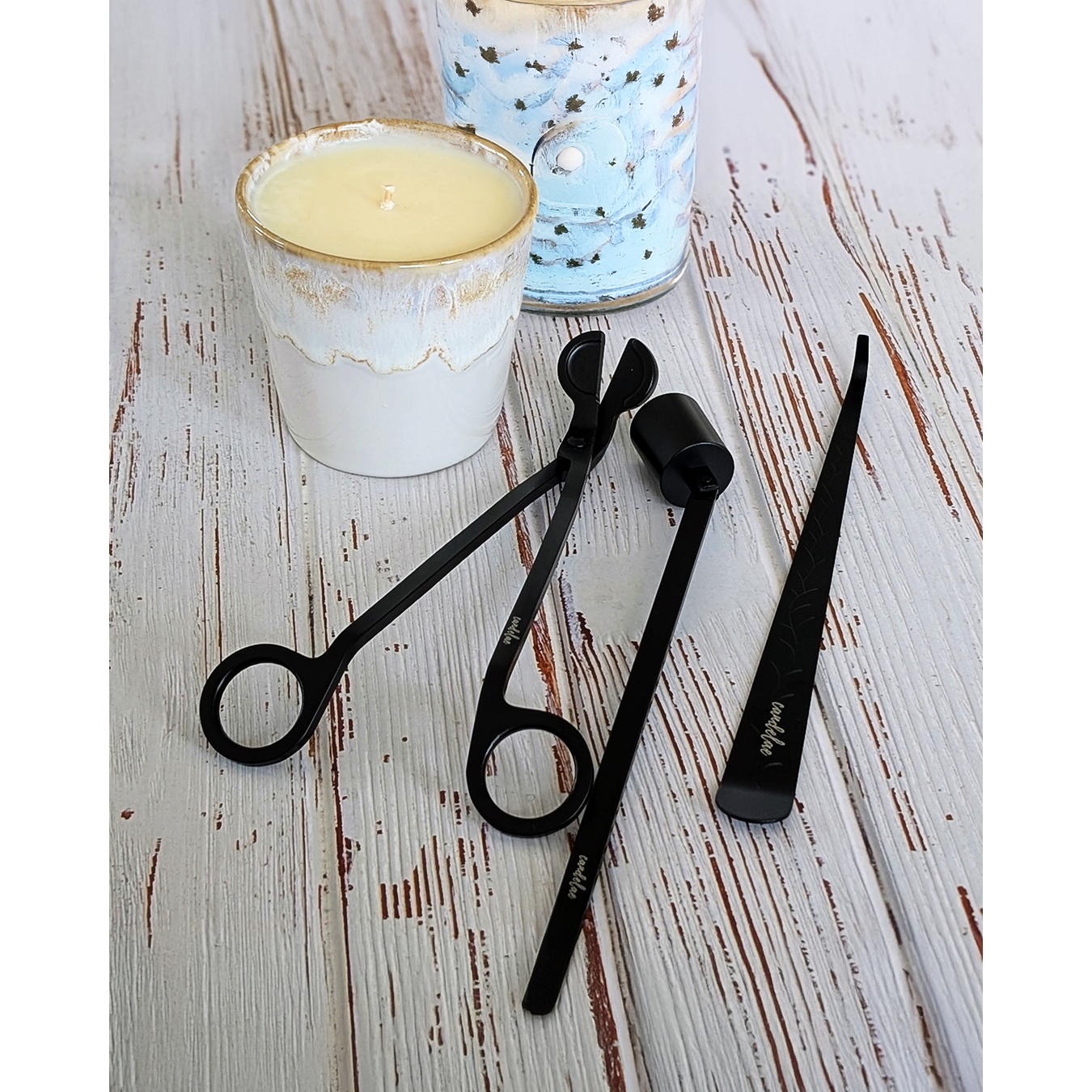 Verlängere die Lebensdauer deiner Duftkerzen und garantiere eine saubere, gleichmäßige Verbrennung mit dem Candelae Kerzenpflege-Set Schwarz – ein hochwertiges 3‑teiliges Zubehör-Set aus robustem Edelstahl, das Brenndauer und Duftgenuss deutlich verbessert.