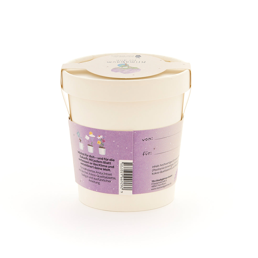 Alles drin für einen Klimabaum: Das Set enthält Klimabaum-Saatgut (Paulownia tomentosa), eine Kokos-Quelltablette, einen Anzuchtbecher und eine Anleitung. Mit etwas Pflege wächst daraus ein Klimabaum mit großer Wirkung im Garten.
